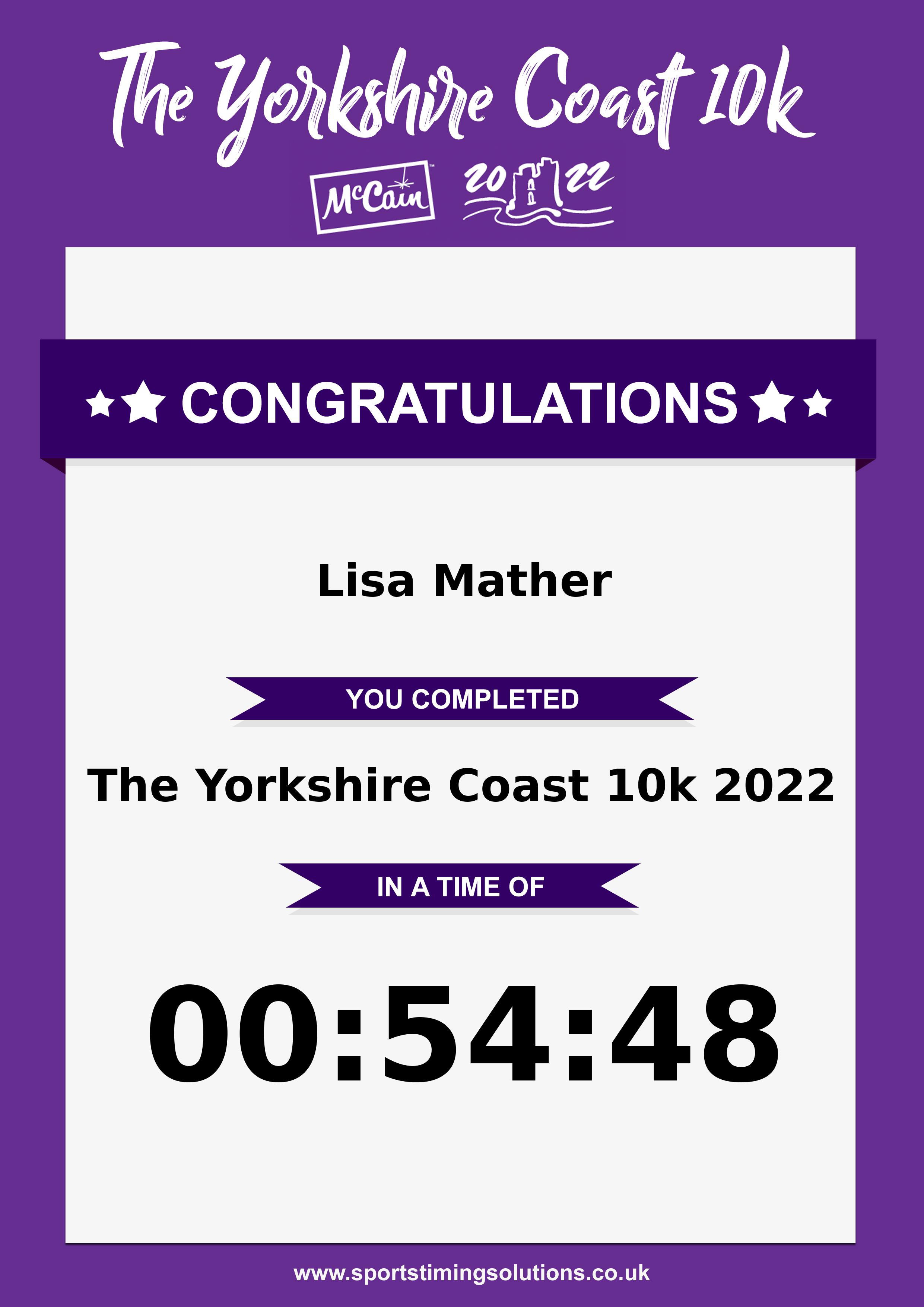 Congratulations Lisa Mather after completing The Yorkshire Coast 10k 2022 why not remember your accomplishment by purchasing our unique professionally printed, high quality 11oz race results mug. Keep that lasting memory forever. All of our race mugs mugs are personally designed and made to order and ready to deliver within 5–10 business days. Although our mugs are dishwasher safe the high temperatures of the dishwasher can fade the images. We advise handwashing only.Delivery is £3.50 Includes P&P. We only deliver within the UK