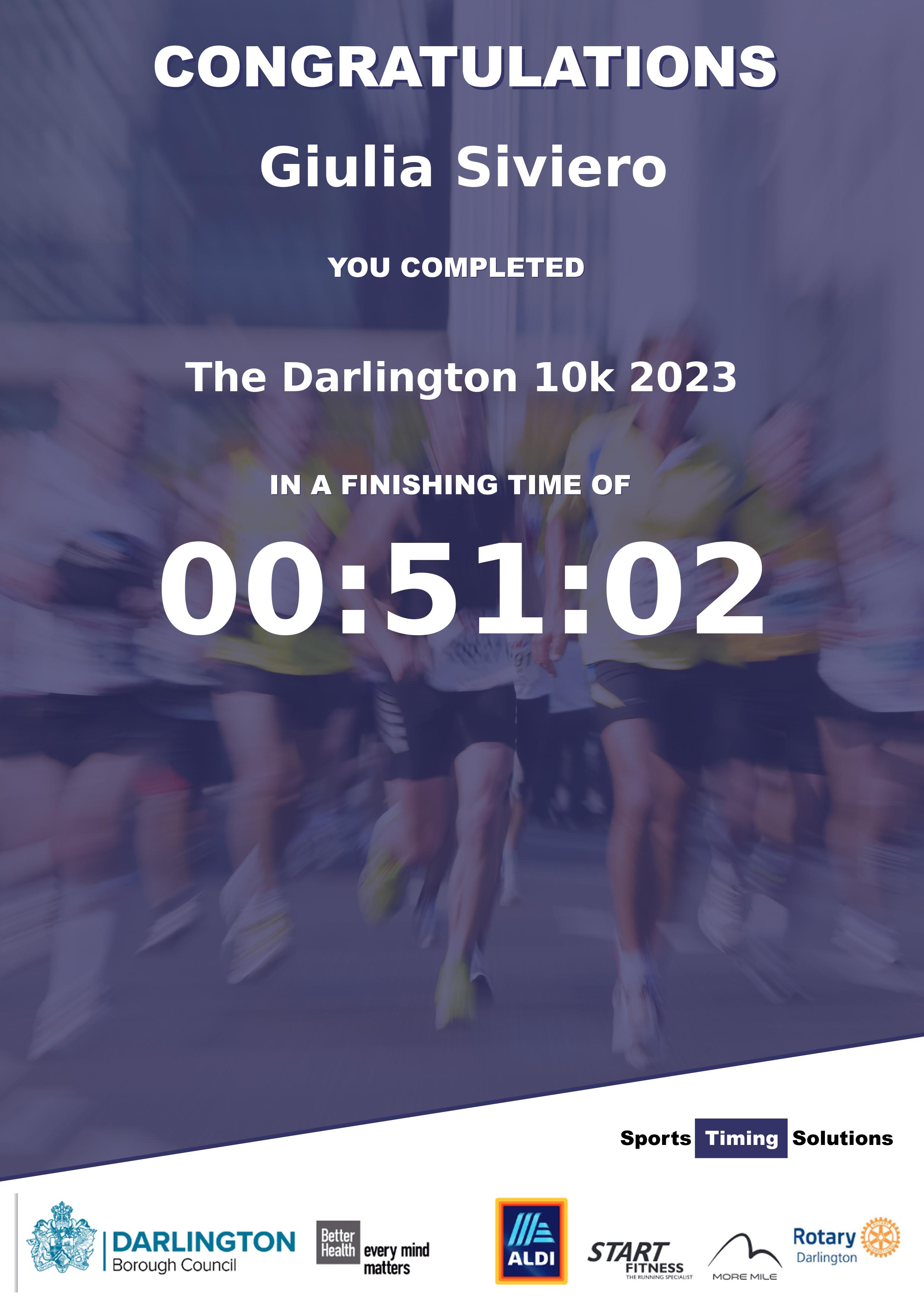 Congratulations Giulia Siviero after completing The Darlington 10k 2023 why not remember your accomplishment by purchasing our unique professionally printed, high quality 11oz race results mug. Keep that lasting memory forever. All of our race mugs mugs are personally designed and made to order and ready to deliver within 5–10 business days. Although our mugs are dishwasher safe the high temperatures of the dishwasher can fade the images. We advise handwashing only.Delivery is £3.50 Includes P&P. We only deliver within the UK