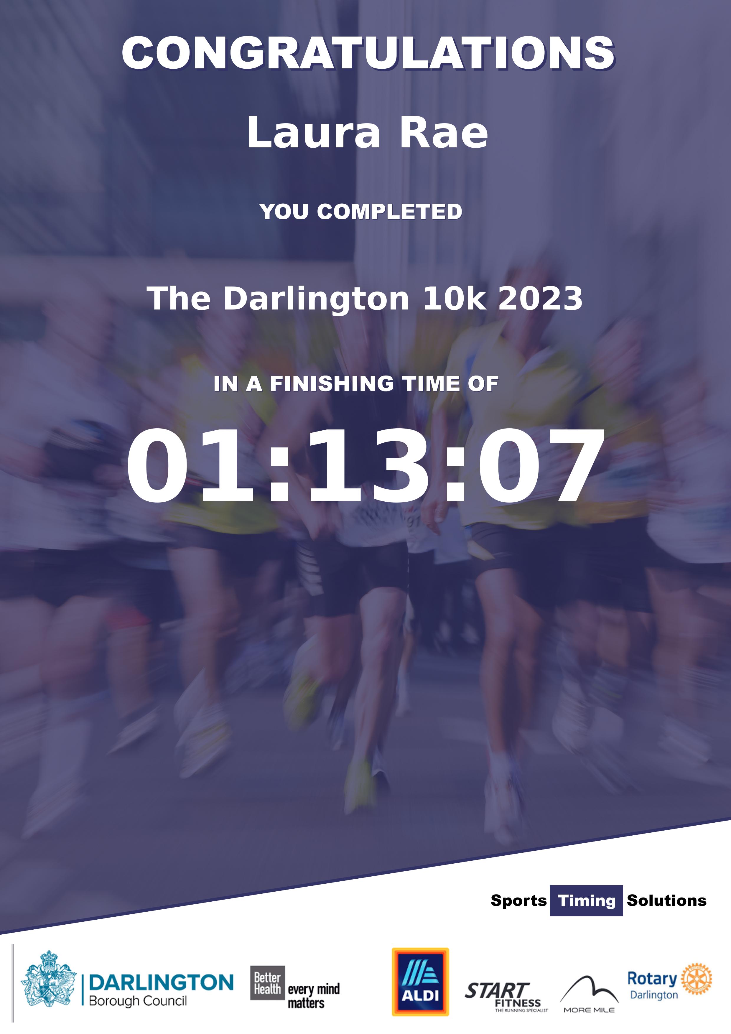 Congratulations Laura Rae after completing The Darlington 10k 2023 why not remember your accomplishment by purchasing our unique professionally printed, high quality 11oz race results mug. Keep that lasting memory forever. All of our race mugs mugs are personally designed and made to order and ready to deliver within 5–10 business days. Although our mugs are dishwasher safe the high temperatures of the dishwasher can fade the images. We advise handwashing only.Delivery is £3.50 Includes P&P. We only deliver within the UK