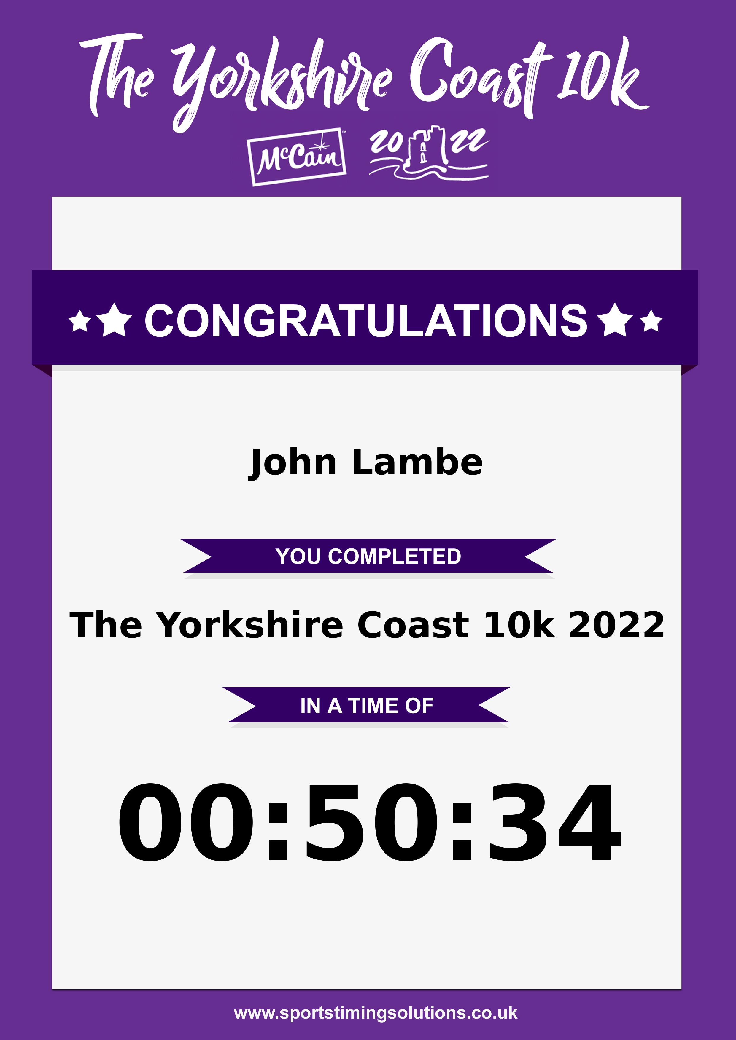 Congratulations John Lambe after completing The Yorkshire Coast 10k 2022 why not remember your accomplishment by purchasing our unique professionally printed, high quality 11oz race results mug. Keep that lasting memory forever. All of our race mugs mugs are personally designed and made to order and ready to deliver within 5–10 business days. Although our mugs are dishwasher safe the high temperatures of the dishwasher can fade the images. We advise handwashing only.Delivery is £3.50 Includes P&P. We only deliver within the UK