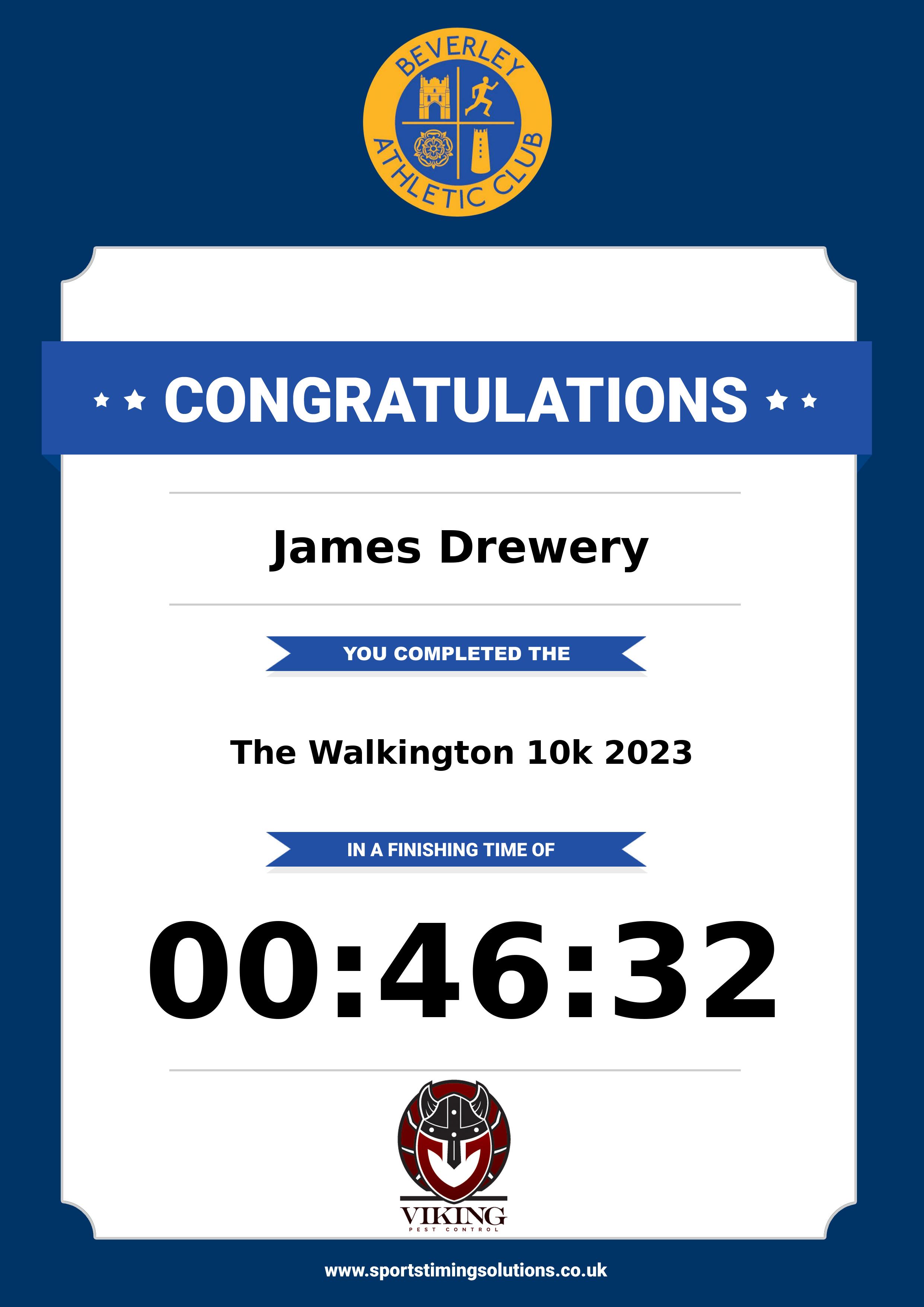 Congratulations James Drewery after completing The Walkington 10k 2023 why not remember your accomplishment by purchasing our unique professionally printed, high quality 11oz race results mug. Keep that lasting memory forever. All of our race mugs mugs are personally designed and made to order and ready to deliver within 5–10 business days. Although our mugs are dishwasher safe the high temperatures of the dishwasher can fade the images. We advise handwashing only.Delivery is £3.50 Includes P&P. We only deliver within the UK