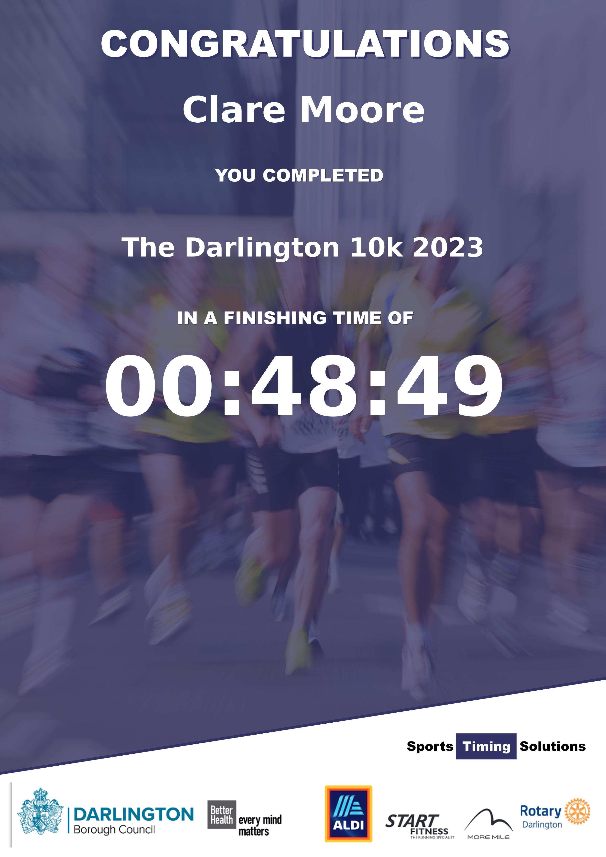 Congratulations Clare Moore after completing The Darlington 10k 2023 why not remember your accomplishment by purchasing our unique professionally printed, high quality 11oz race results mug. Keep that lasting memory forever. All of our race mugs mugs are personally designed and made to order and ready to deliver within 5–10 business days. Although our mugs are dishwasher safe the high temperatures of the dishwasher can fade the images. We advise handwashing only.Delivery is £3.50 Includes P&P. We only deliver within the UK
