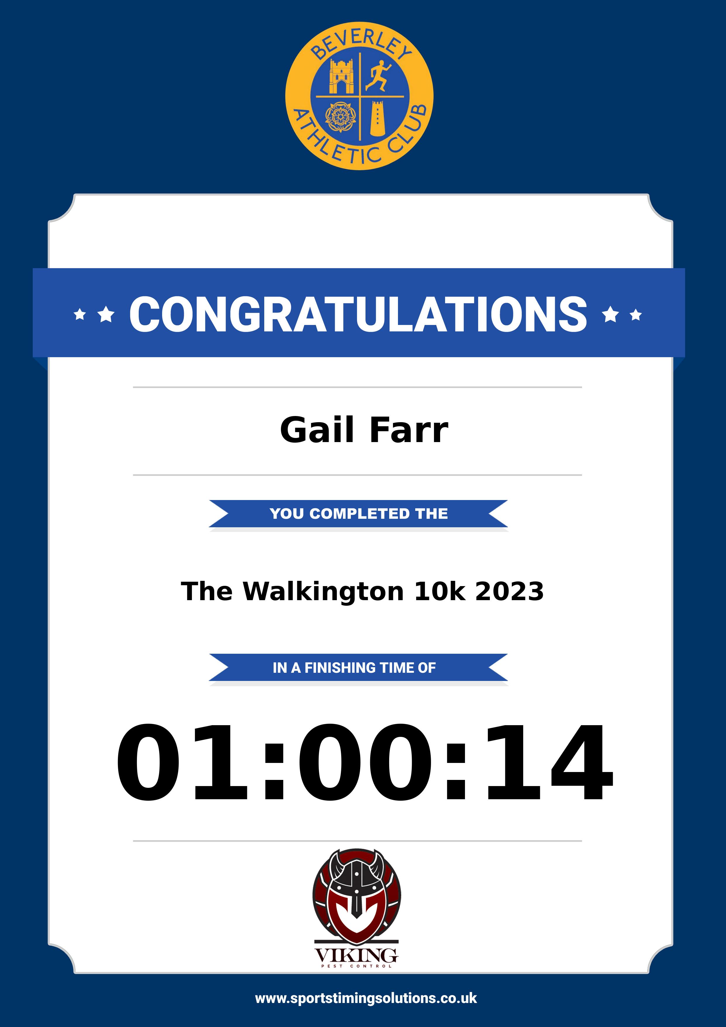 Congratulations Gail Farr after completing The Walkington 10k 2023 why not remember your accomplishment by purchasing our unique professionally printed, high quality 11oz race results mug. Keep that lasting memory forever. All of our race mugs mugs are personally designed and made to order and ready to deliver within 5–10 business days. Although our mugs are dishwasher safe the high temperatures of the dishwasher can fade the images. We advise handwashing only.Delivery is £3.50 Includes P&P. We only deliver within the UK