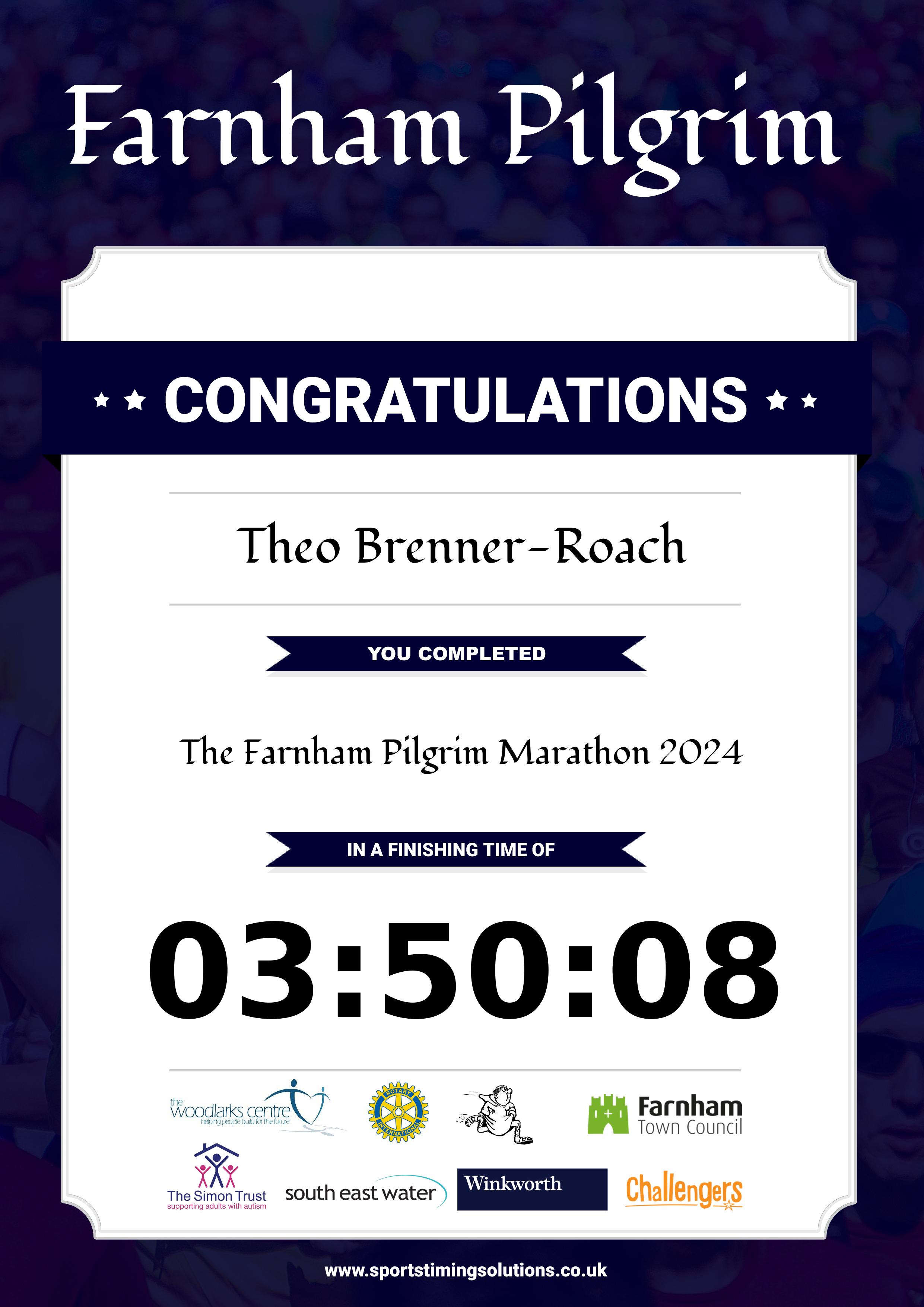 Congratulations Theo Brenner-Roach after completing The Farnham Pilgrim Marathon 2024 why not remember your accomplishment by purchasing our unique professionally printed, high quality 11oz race results mug. Keep that lasting memory forever. All of our race mugs mugs are personally designed and made to order and ready to deliver within 5–10 business days. Although our mugs are dishwasher safe the high temperatures of the dishwasher can fade the images. We advise handwashing only.Delivery is £3.50 Includes P&P. We only deliver within the UK