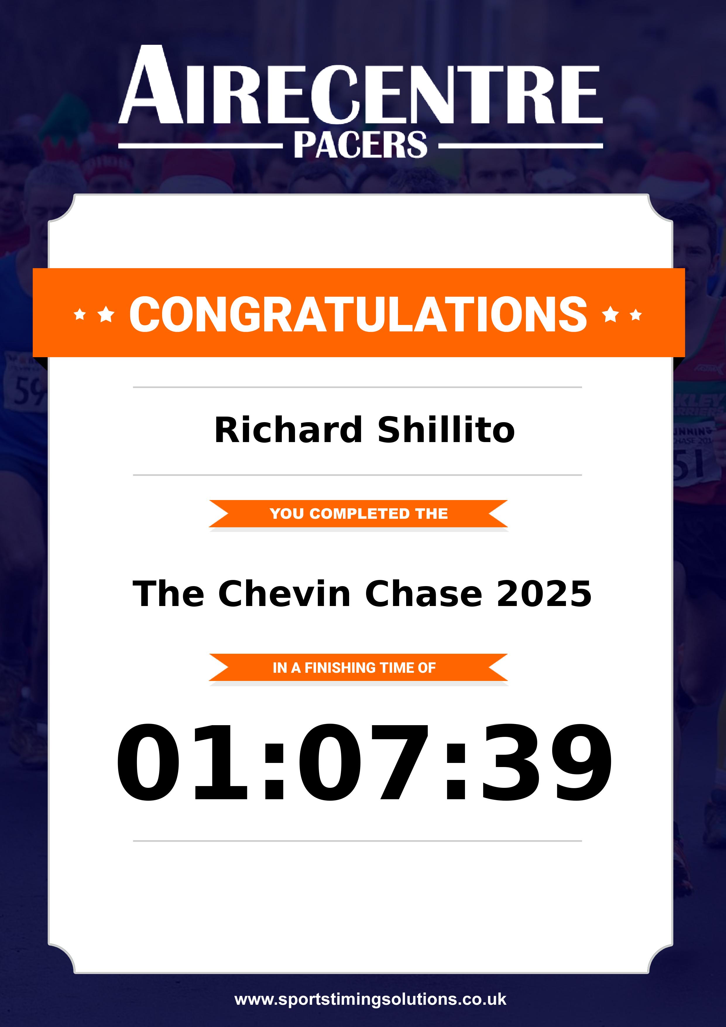 Congratulations Richard Shillito after completing The Chevin Chase 2025 why not remember your accomplishment by purchasing our unique professionally printed, high quality 11oz race results mug. Keep that lasting memory forever. All of our race mugs mugs are personally designed and made to order and ready to deliver within 5–10 business days. Although our mugs are dishwasher safe the high temperatures of the dishwasher can fade the images. We advise handwashing only.Delivery is £3.50 Includes P&P. We only deliver within the UK