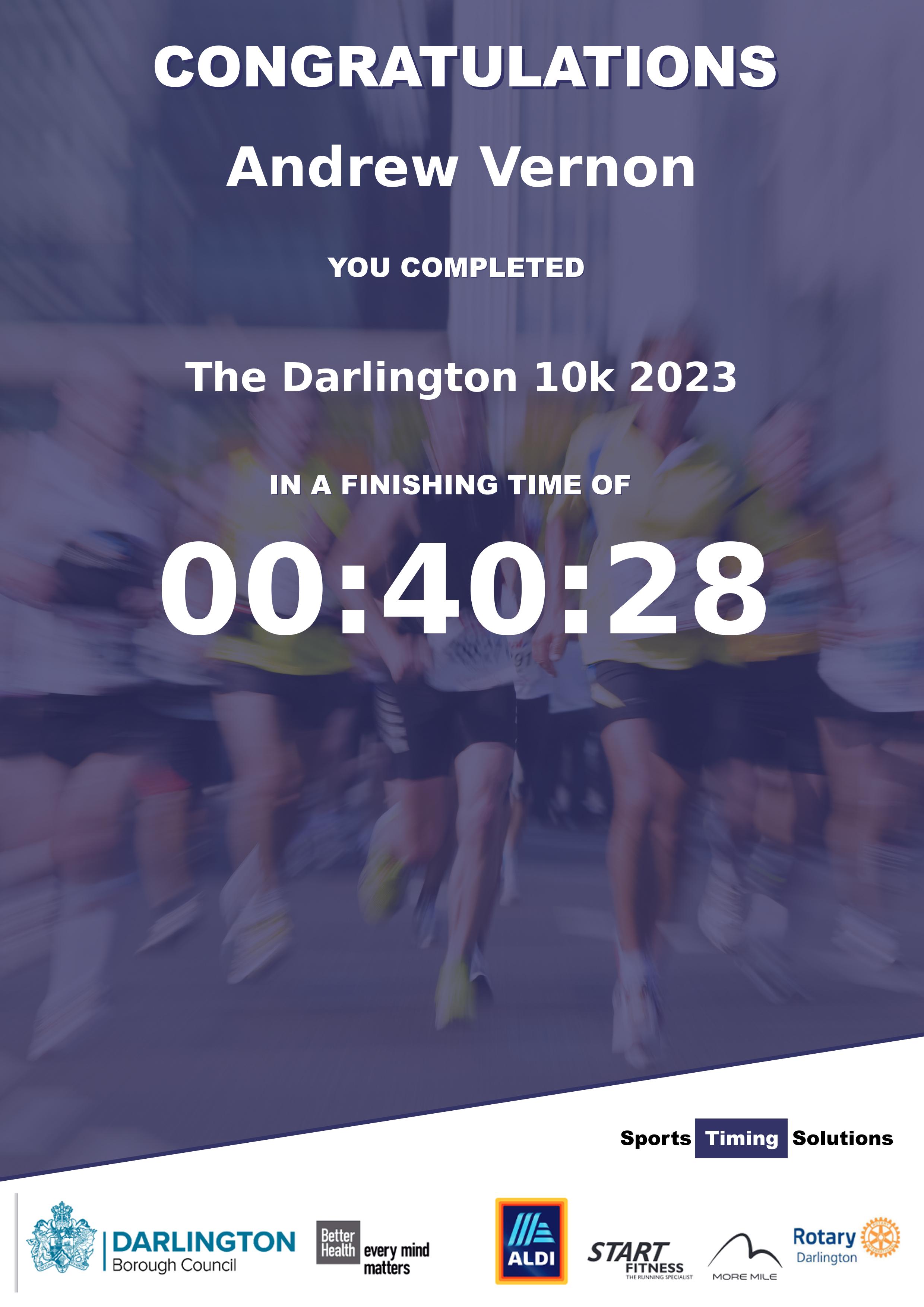 Congratulations Andrew Vernon after completing The Darlington 10k 2023 why not remember your accomplishment by purchasing our unique professionally printed, high quality 11oz race results mug. Keep that lasting memory forever. All of our race mugs mugs are personally designed and made to order and ready to deliver within 5–10 business days. Although our mugs are dishwasher safe the high temperatures of the dishwasher can fade the images. We advise handwashing only.Delivery is £3.50 Includes P&P. We only deliver within the UK