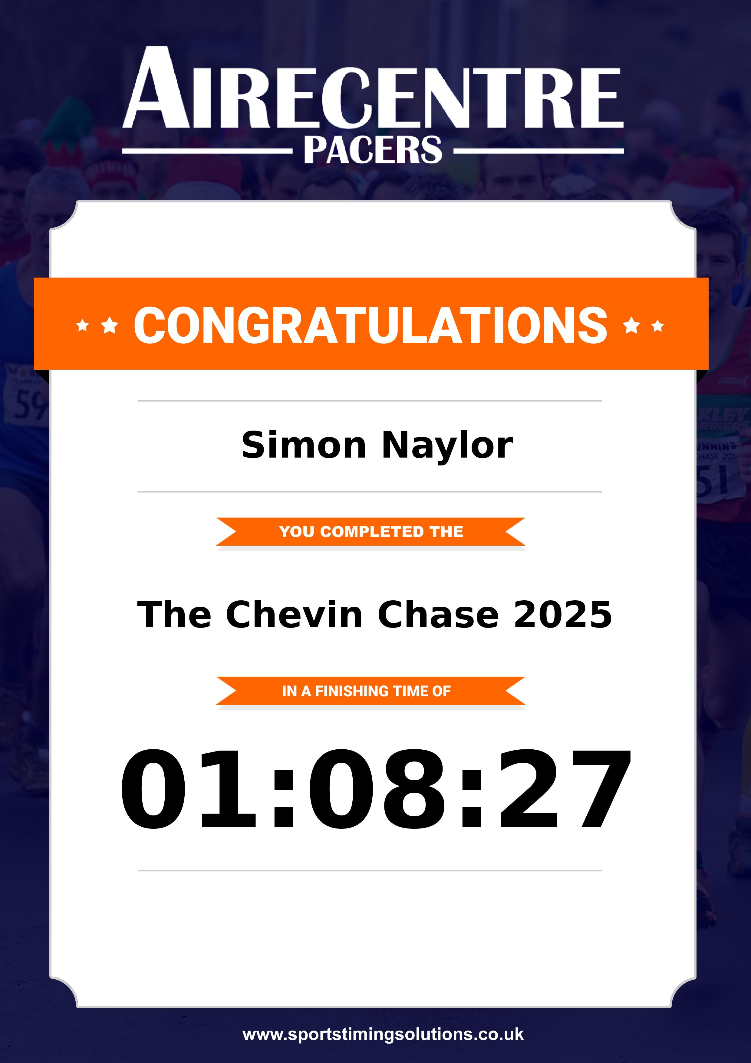 Congratulations Simon Naylor after completing The Chevin Chase 2025 why not remember your accomplishment by purchasing our unique professionally printed, high quality 11oz race results mug. Keep that lasting memory forever. All of our race mugs mugs are personally designed and made to order and ready to deliver within 5–10 business days. Although our mugs are dishwasher safe the high temperatures of the dishwasher can fade the images. We advise handwashing only.Delivery is £3.50 Includes P&P. We only deliver within the UK