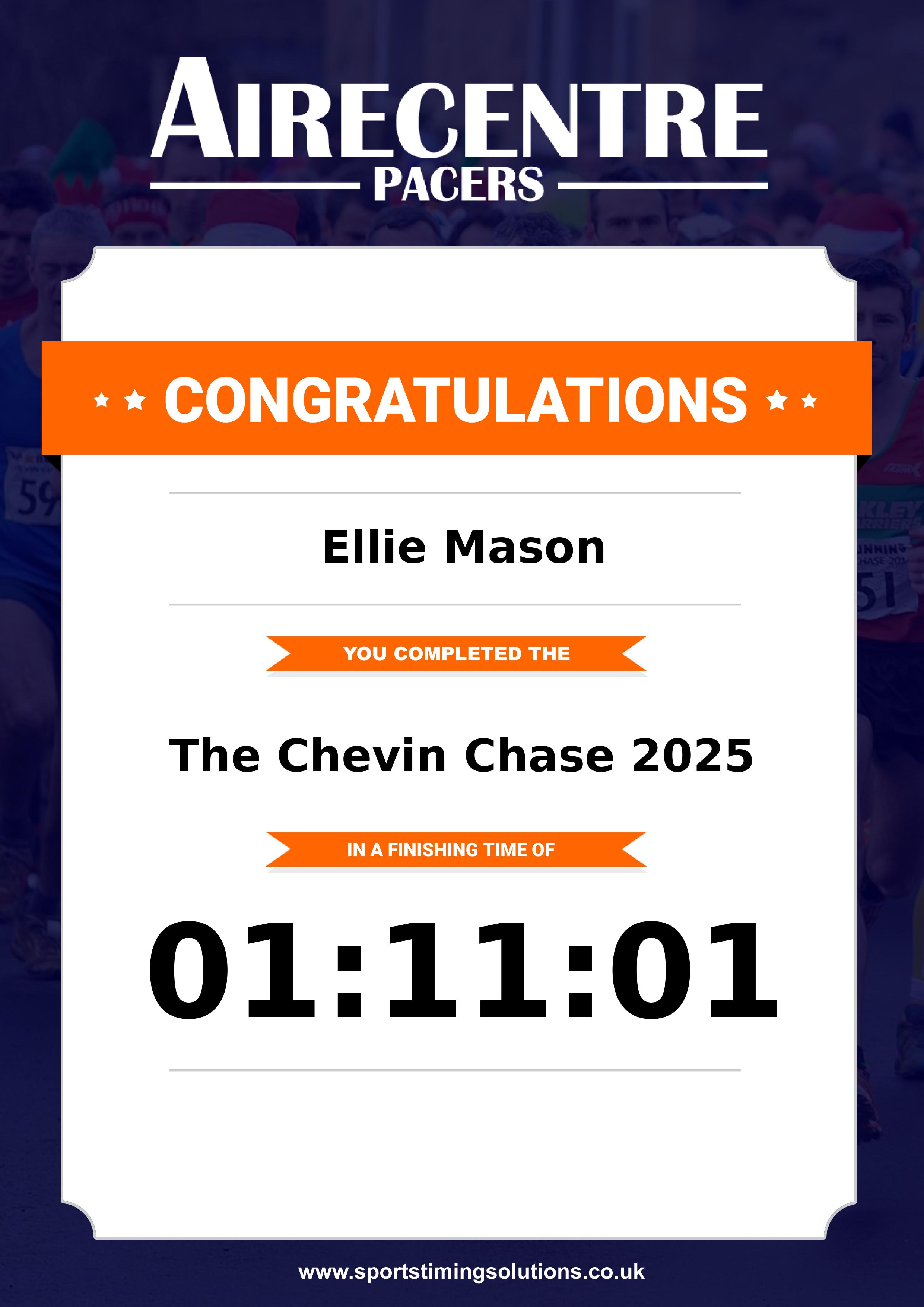Congratulations Ellie Mason after completing The Chevin Chase 2025 why not remember your accomplishment by purchasing our unique professionally printed, high quality 11oz race results mug. Keep that lasting memory forever. All of our race mugs mugs are personally designed and made to order and ready to deliver within 5–10 business days. Although our mugs are dishwasher safe the high temperatures of the dishwasher can fade the images. We advise handwashing only.Delivery is £3.50 Includes P&P. We only deliver within the UK