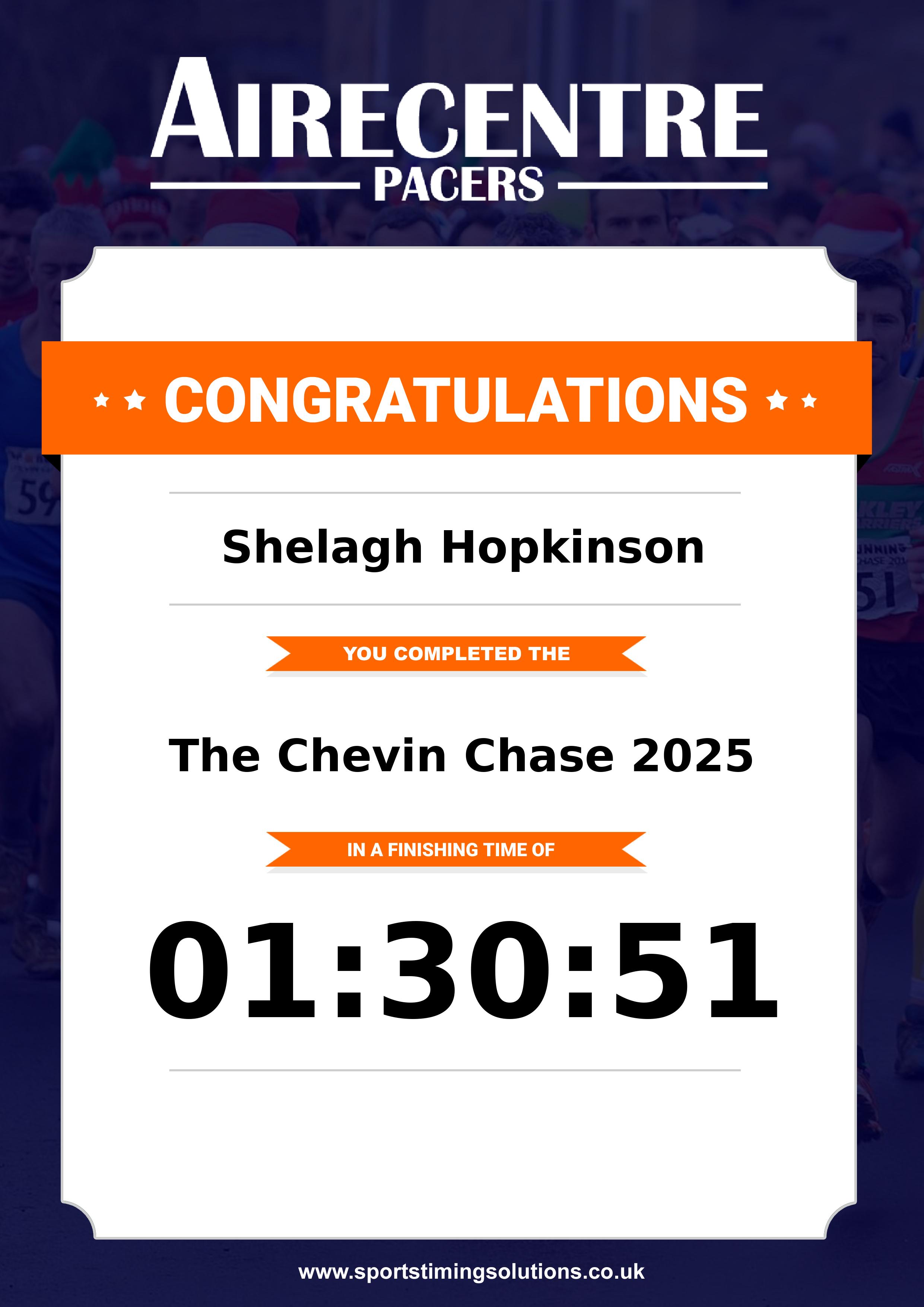 Congratulations Shelagh Hopkinson after completing The Chevin Chase 2025 why not remember your accomplishment by purchasing our unique professionally printed, high quality 11oz race results mug. Keep that lasting memory forever. All of our race mugs mugs are personally designed and made to order and ready to deliver within 5–10 business days. Although our mugs are dishwasher safe the high temperatures of the dishwasher can fade the images. We advise handwashing only.Delivery is £3.50 Includes P&P. We only deliver within the UK