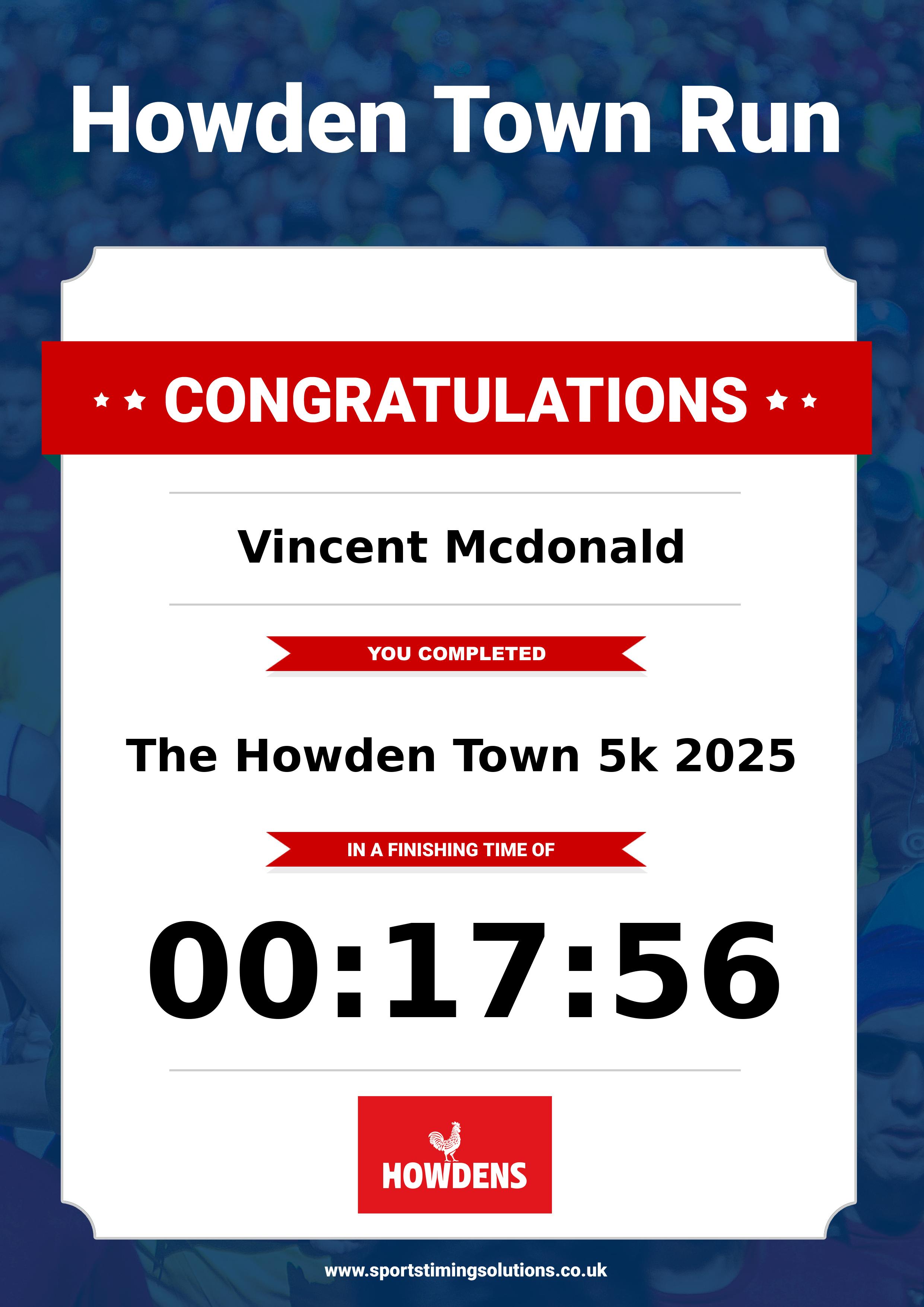 Congratulations Vincent Mcdonald after completing The Howden Town 5k 2025 why not remember your accomplishment by purchasing our unique professionally printed, high quality 11oz race results mug. Keep that lasting memory forever. All of our race mugs mugs are personally designed and made to order and ready to deliver within 5–10 business days. Although our mugs are dishwasher safe the high temperatures of the dishwasher can fade the images. We advise handwashing only.Delivery is £3.50 Includes P&P. We only deliver within the UK