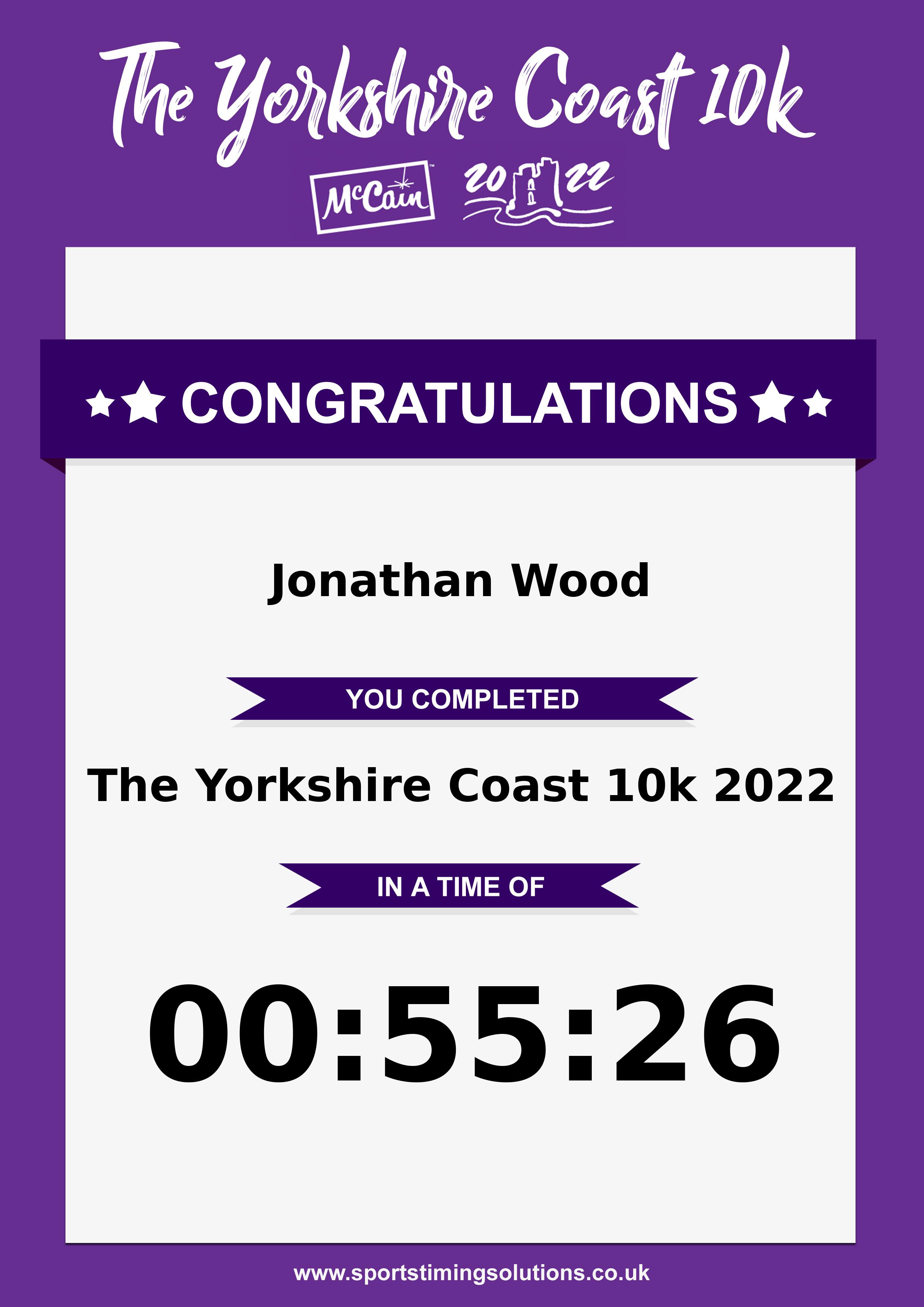 Congratulations Jonathan Wood after completing The Yorkshire Coast 10k 2022 why not remember your accomplishment by purchasing our unique professionally printed, high quality 11oz race results mug. Keep that lasting memory forever. All of our race mugs mugs are personally designed and made to order and ready to deliver within 5–10 business days. Although our mugs are dishwasher safe the high temperatures of the dishwasher can fade the images. We advise handwashing only.Delivery is £3.50 Includes P&P. We only deliver within the UK