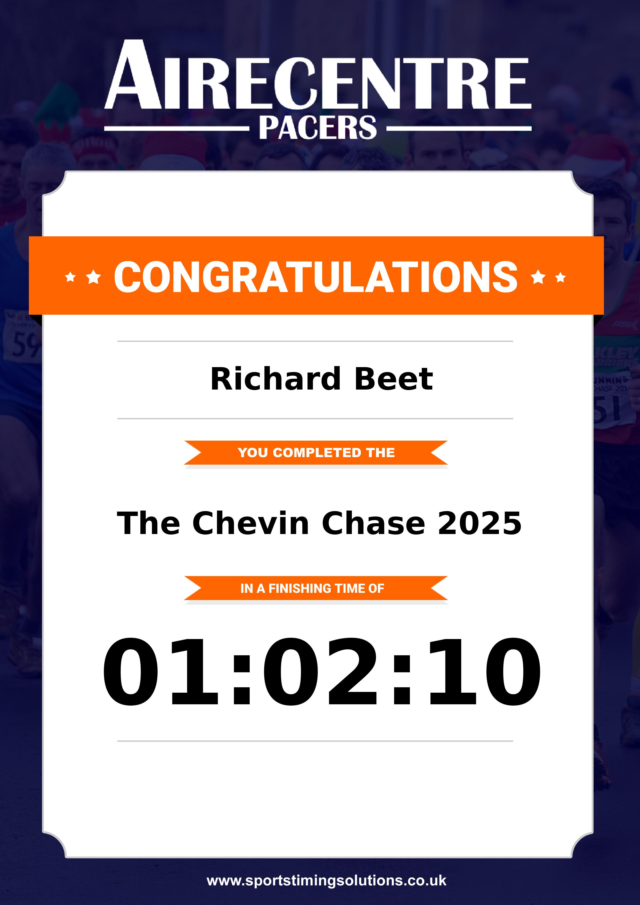 Congratulations Richard Beet after completing The Chevin Chase 2025 why not remember your accomplishment by purchasing our unique professionally printed, high quality 11oz race results mug. Keep that lasting memory forever. All of our race mugs mugs are personally designed and made to order and ready to deliver within 5–10 business days. Although our mugs are dishwasher safe the high temperatures of the dishwasher can fade the images. We advise handwashing only.Delivery is £3.50 Includes P&P. We only deliver within the UK