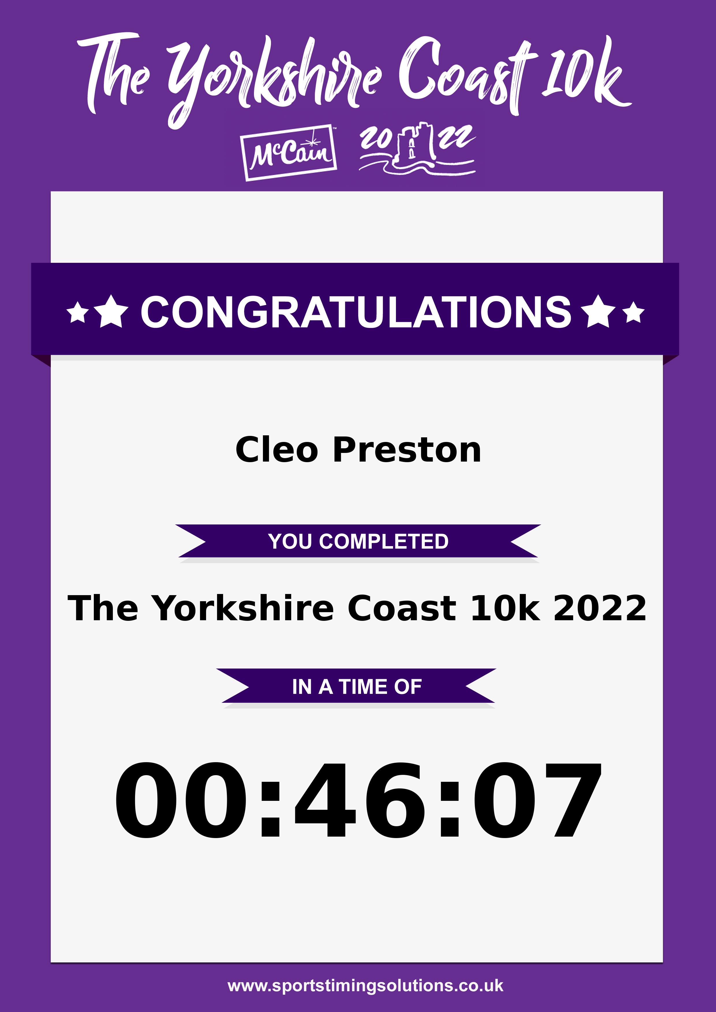 Congratulations Cleo Preston after completing The Yorkshire Coast 10k 2022 why not remember your accomplishment by purchasing our unique professionally printed, high quality 11oz race results mug. Keep that lasting memory forever. All of our race mugs mugs are personally designed and made to order and ready to deliver within 5–10 business days. Although our mugs are dishwasher safe the high temperatures of the dishwasher can fade the images. We advise handwashing only.Delivery is £3.50 Includes P&P. We only deliver within the UK