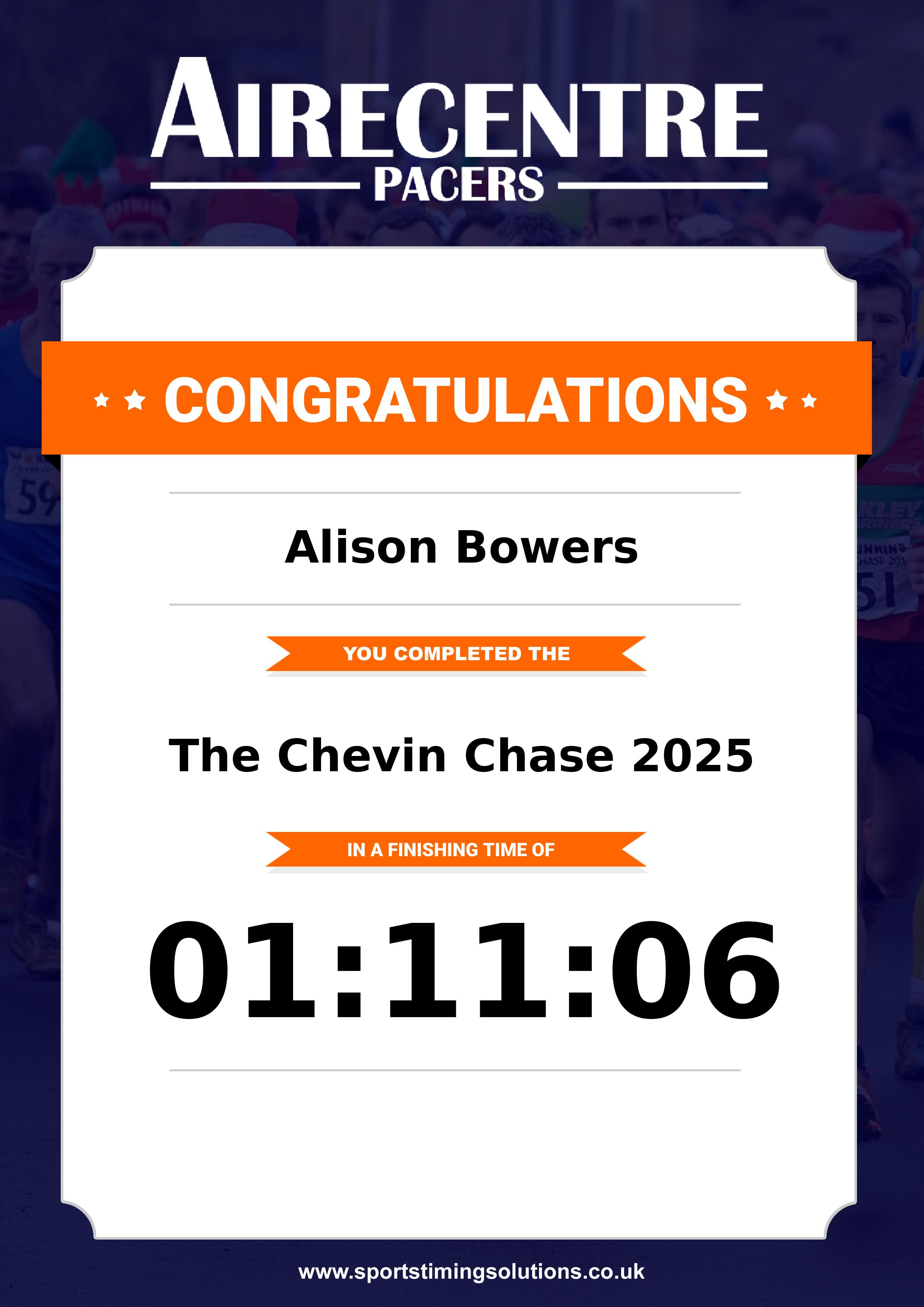 Congratulations Alison Bowers after completing The Chevin Chase 2025 why not remember your accomplishment by purchasing our unique professionally printed, high quality 11oz race results mug. Keep that lasting memory forever. All of our race mugs mugs are personally designed and made to order and ready to deliver within 5–10 business days. Although our mugs are dishwasher safe the high temperatures of the dishwasher can fade the images. We advise handwashing only.Delivery is £3.50 Includes P&P. We only deliver within the UK