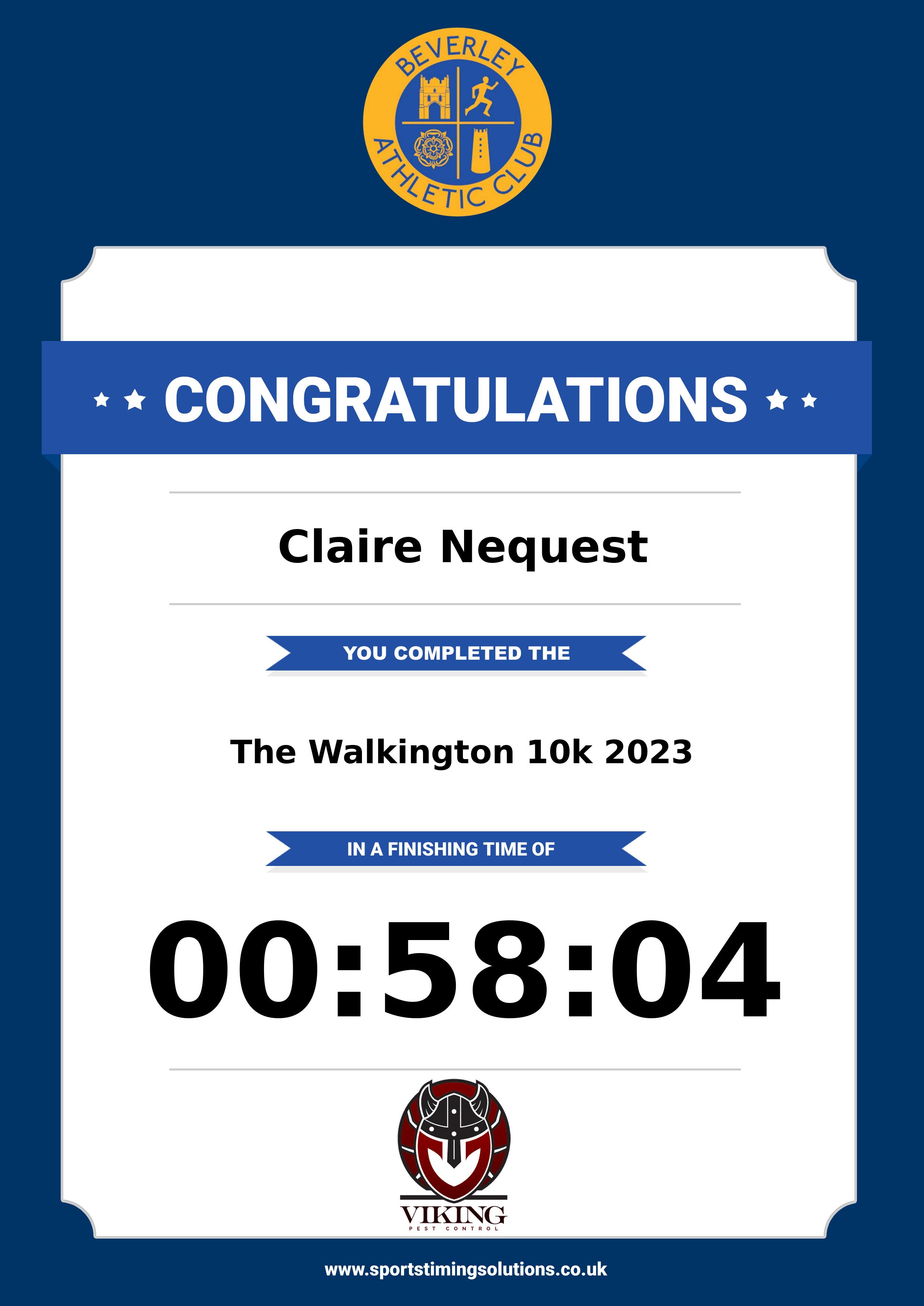Congratulations Claire Nequest after completing The Walkington 10k 2023 why not remember your accomplishment by purchasing our unique professionally printed, high quality 11oz race results mug. Keep that lasting memory forever. All of our race mugs mugs are personally designed and made to order and ready to deliver within 5–10 business days. Although our mugs are dishwasher safe the high temperatures of the dishwasher can fade the images. We advise handwashing only.Delivery is £3.50 Includes P&P. We only deliver within the UK