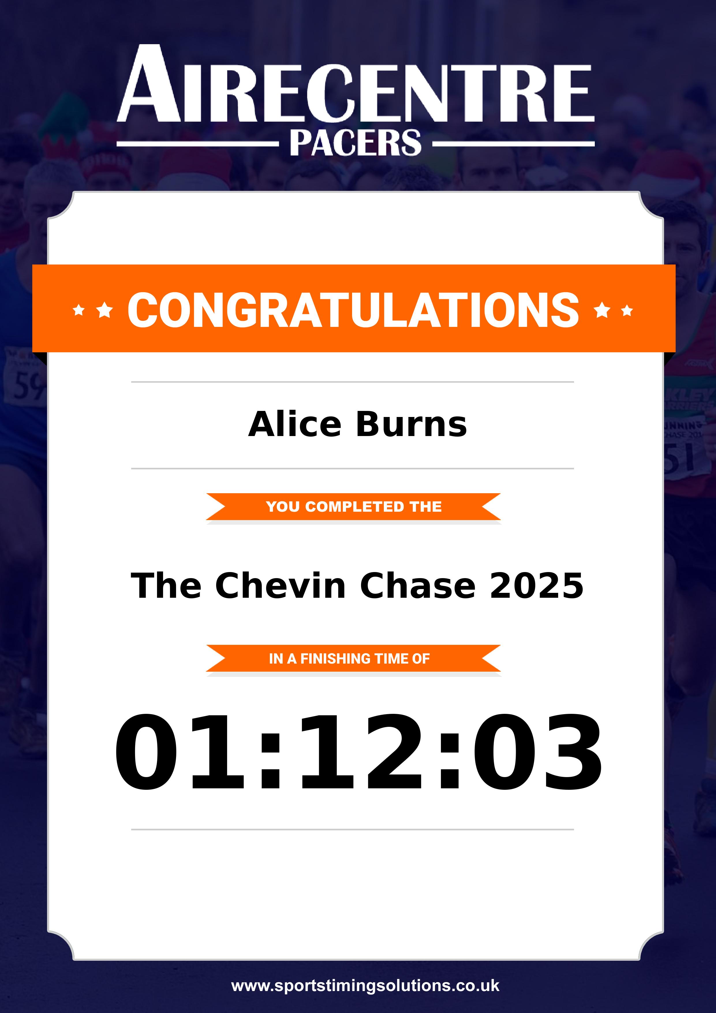 Congratulations Alice Burns after completing The Chevin Chase 2025 why not remember your accomplishment by purchasing our unique professionally printed, high quality 11oz race results mug. Keep that lasting memory forever. All of our race mugs mugs are personally designed and made to order and ready to deliver within 5–10 business days. Although our mugs are dishwasher safe the high temperatures of the dishwasher can fade the images. We advise handwashing only.Delivery is £3.50 Includes P&P. We only deliver within the UK