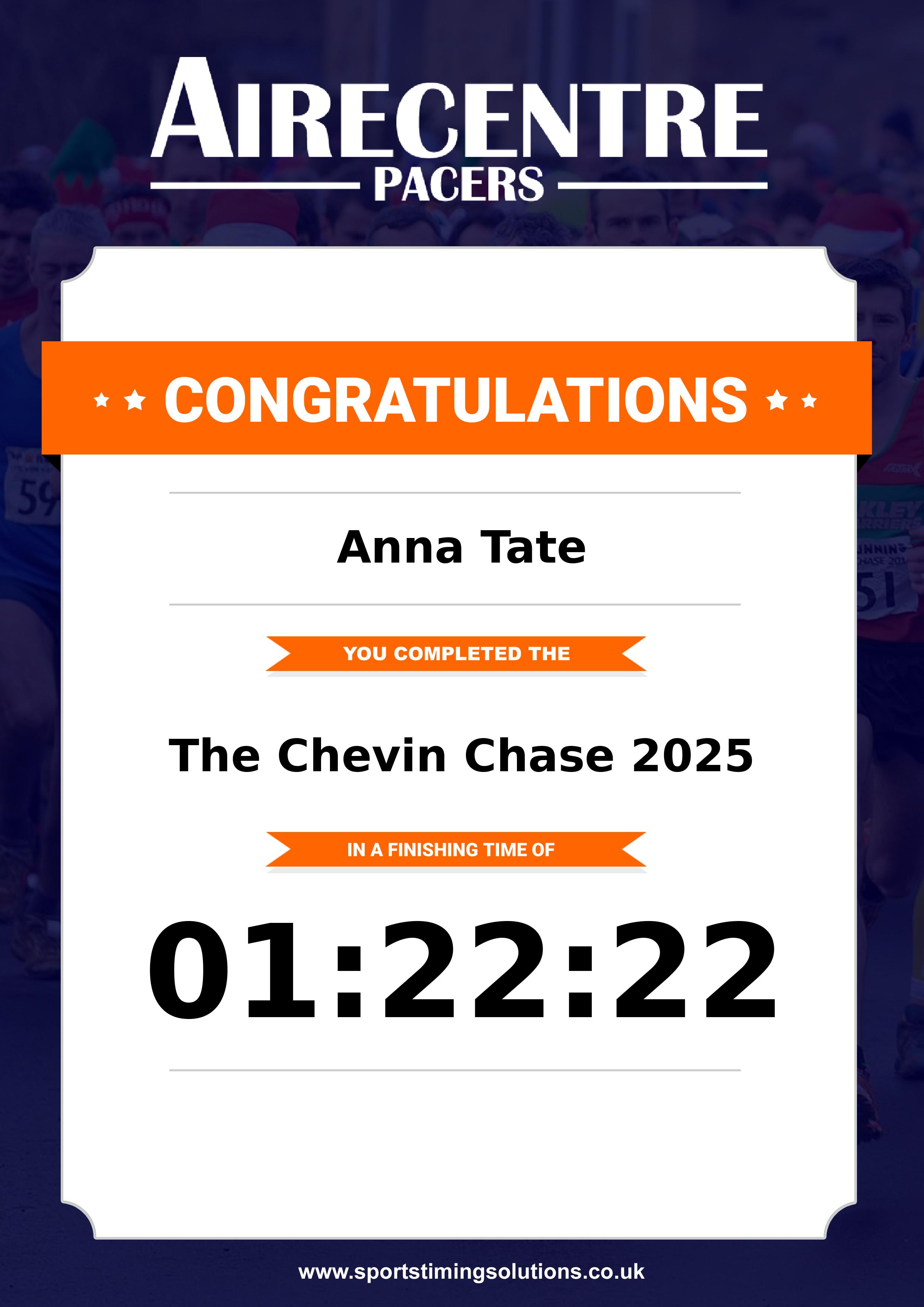 Congratulations Anna Tate after completing The Chevin Chase 2025 why not remember your accomplishment by purchasing our unique professionally printed, high quality 11oz race results mug. Keep that lasting memory forever. All of our race mugs mugs are personally designed and made to order and ready to deliver within 5–10 business days. Although our mugs are dishwasher safe the high temperatures of the dishwasher can fade the images. We advise handwashing only.Delivery is £3.50 Includes P&P. We only deliver within the UK