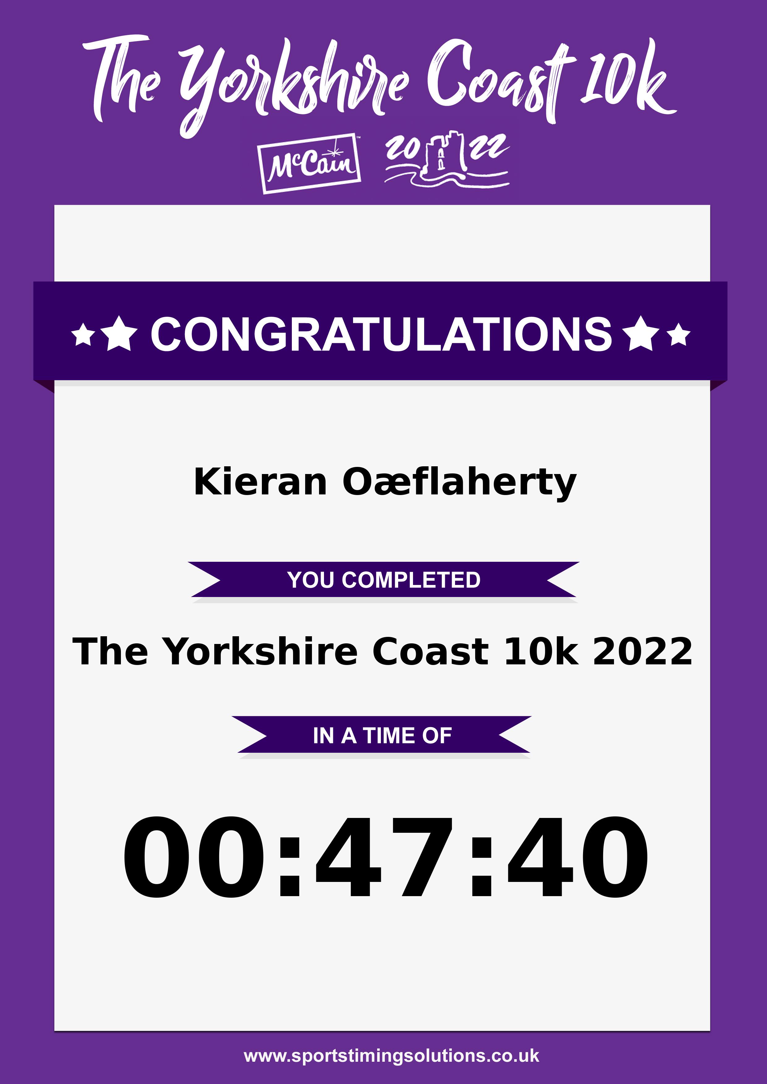 Congratulations Kieran Oæflaherty after completing The Yorkshire Coast 10k 2022 why not remember your accomplishment by purchasing our unique professionally printed, high quality 11oz race results mug. Keep that lasting memory forever. All of our race mugs mugs are personally designed and made to order and ready to deliver within 5–10 business days. Although our mugs are dishwasher safe the high temperatures of the dishwasher can fade the images. We advise handwashing only.Delivery is £3.50 Includes P&P. We only deliver within the UK