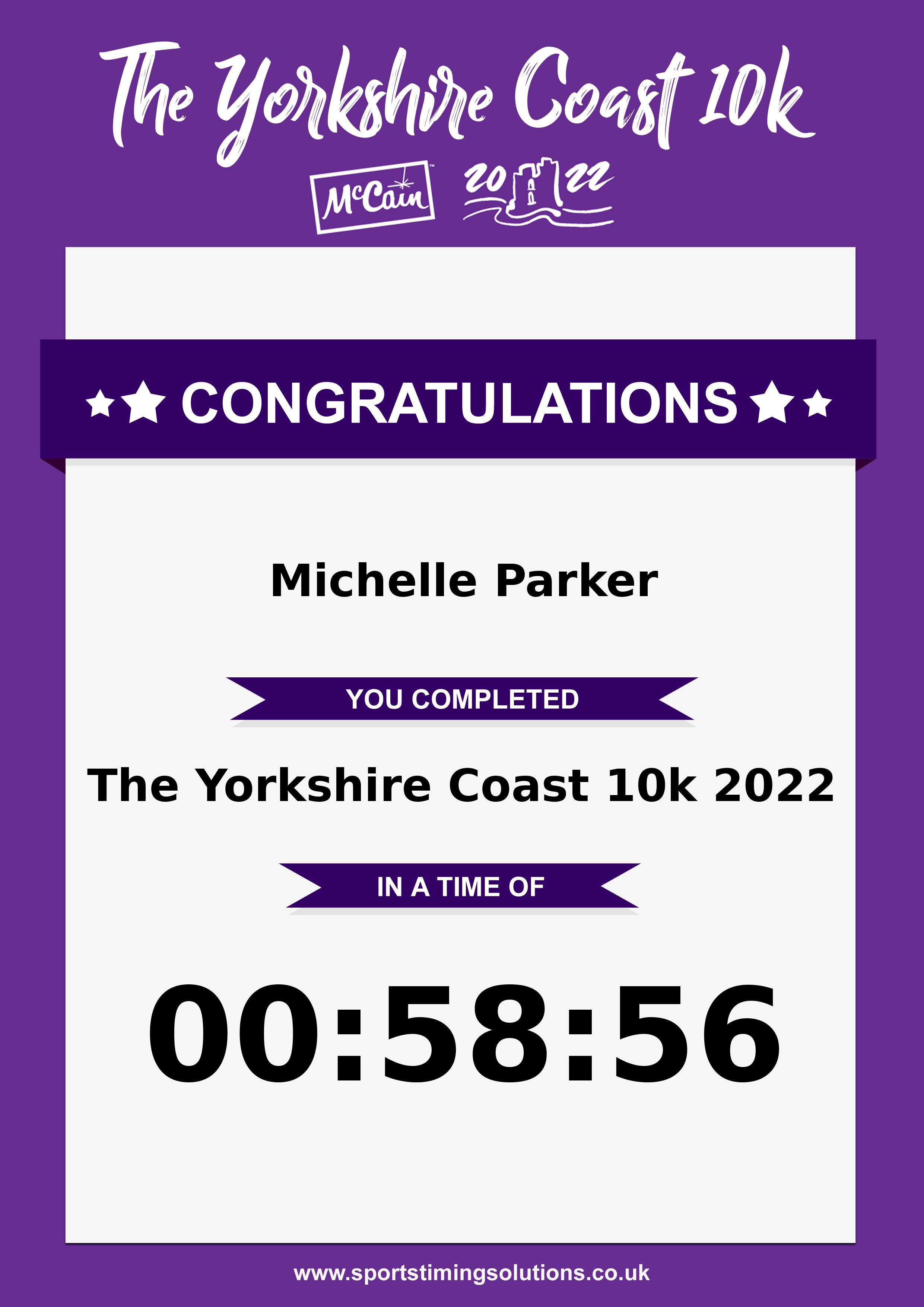 Congratulations Michelle Parker after completing The Yorkshire Coast 10k 2022 why not remember your accomplishment by purchasing our unique professionally printed, high quality 11oz race results mug. Keep that lasting memory forever. All of our race mugs mugs are personally designed and made to order and ready to deliver within 5–10 business days. Although our mugs are dishwasher safe the high temperatures of the dishwasher can fade the images. We advise handwashing only.Delivery is £3.50 Includes P&P. We only deliver within the UK