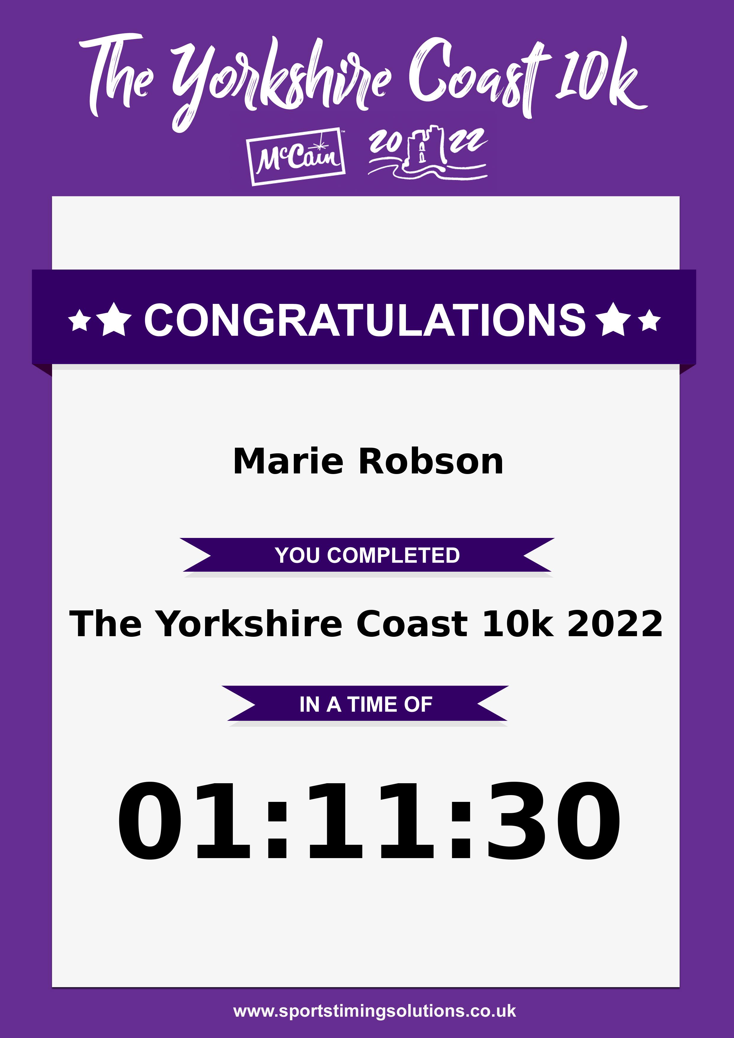 Congratulations Marie Robson after completing The Yorkshire Coast 10k 2022 why not remember your accomplishment by purchasing our unique professionally printed, high quality 11oz race results mug. Keep that lasting memory forever. All of our race mugs mugs are personally designed and made to order and ready to deliver within 5–10 business days. Although our mugs are dishwasher safe the high temperatures of the dishwasher can fade the images. We advise handwashing only.Delivery is £3.50 Includes P&P. We only deliver within the UK