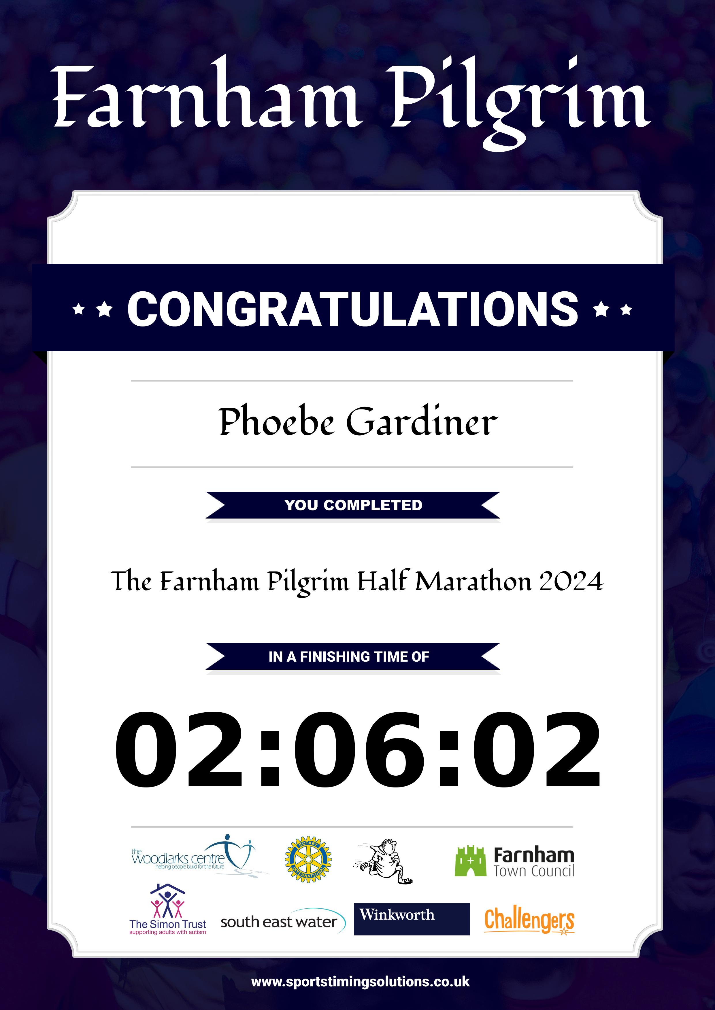Congratulations Phoebe Gardiner after completing The Farnham Pilgrim Half Marathon 2024 why not remember your accomplishment by purchasing our unique professionally printed, high quality 11oz race results mug. Keep that lasting memory forever. All of our race mugs mugs are personally designed and made to order and ready to deliver within 5–10 business days. Although our mugs are dishwasher safe the high temperatures of the dishwasher can fade the images. We advise handwashing only.Delivery is £3.50 Includes P&P. We only deliver within the UK