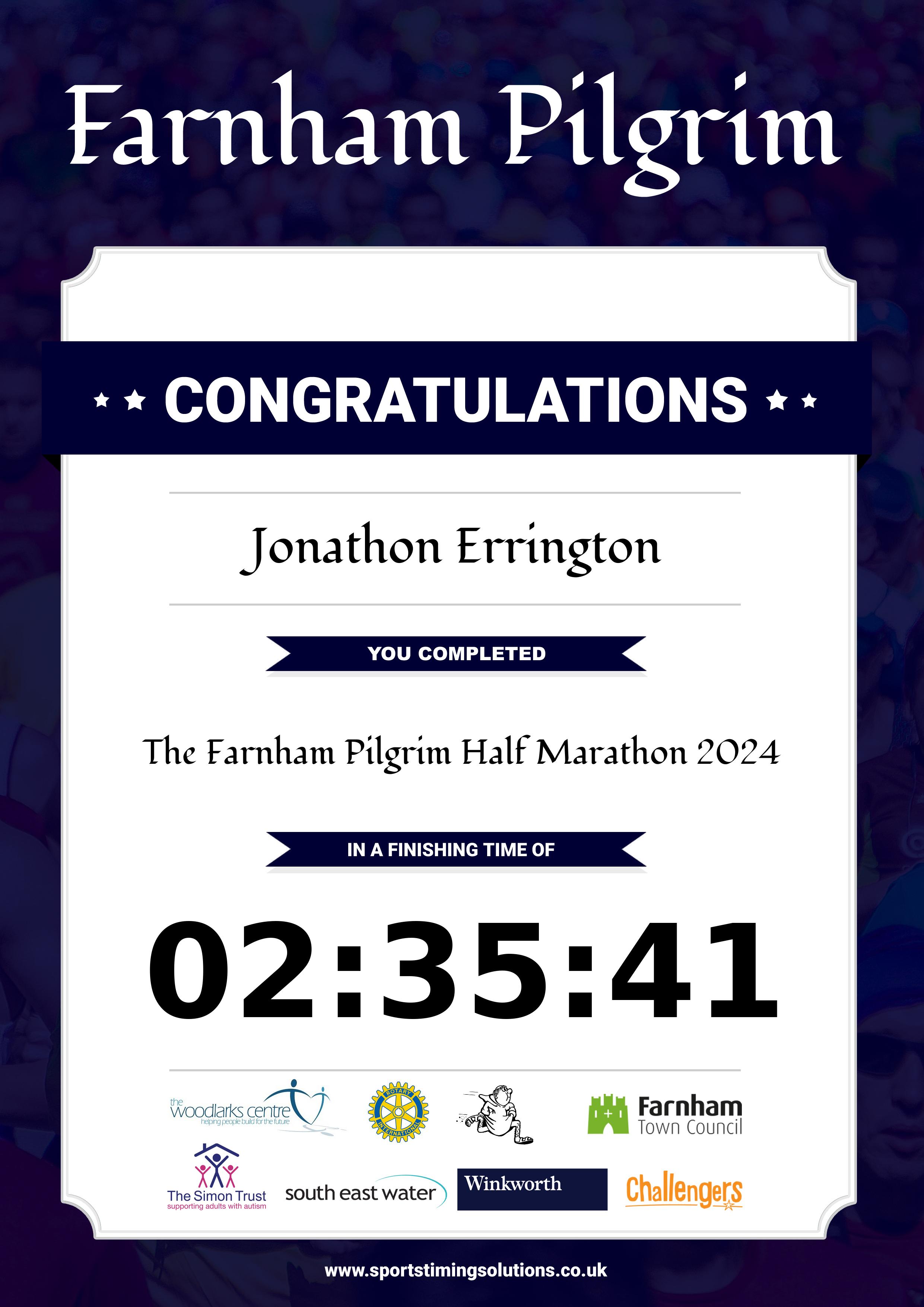 Congratulations Jonathon Errington after completing The Farnham Pilgrim Half Marathon 2024 why not remember your accomplishment by purchasing our unique professionally printed, high quality 11oz race results mug. Keep that lasting memory forever. All of our race mugs mugs are personally designed and made to order and ready to deliver within 5–10 business days. Although our mugs are dishwasher safe the high temperatures of the dishwasher can fade the images. We advise handwashing only.Delivery is £3.50 Includes P&P. We only deliver within the UK