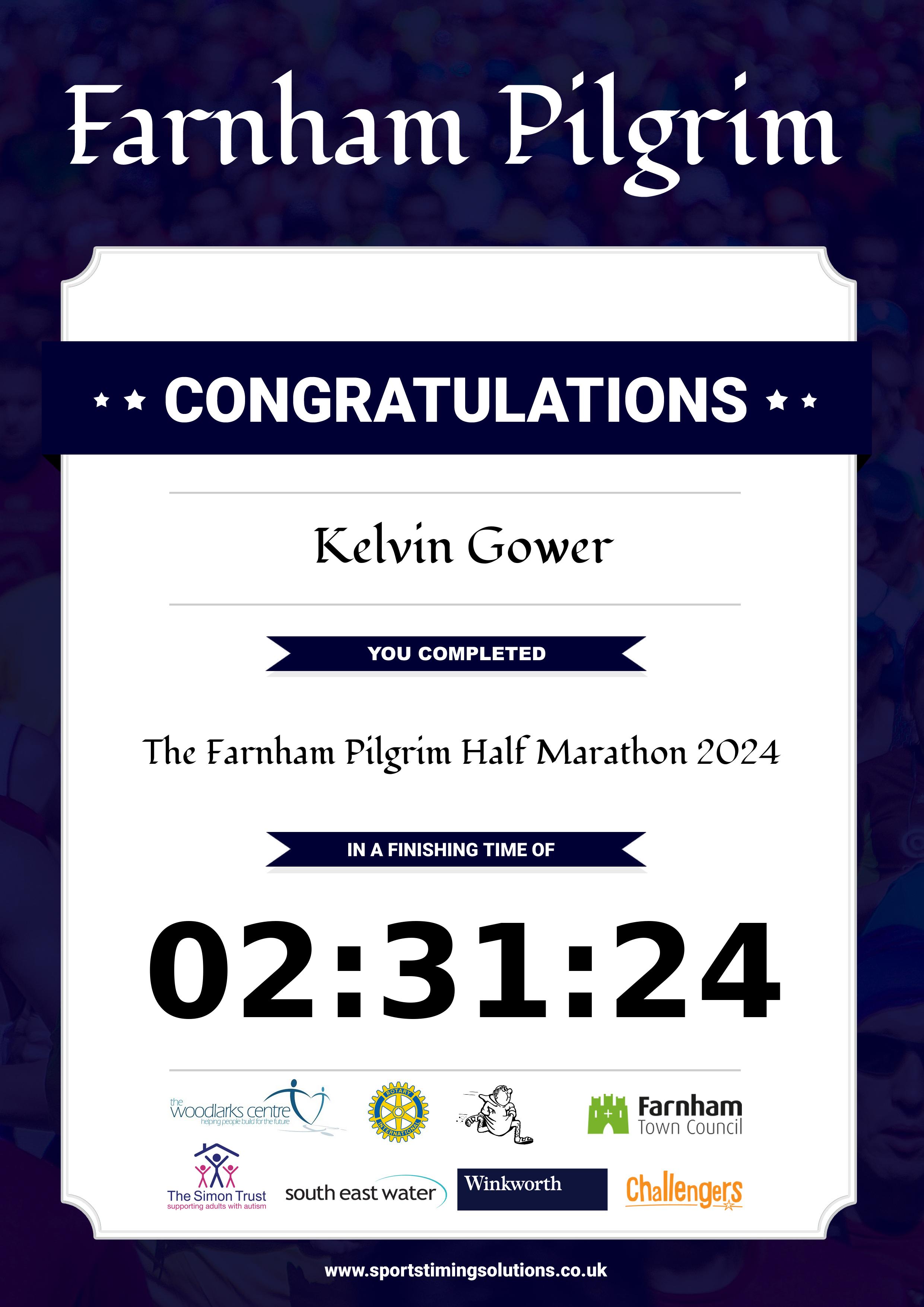 Congratulations Kelvin Gower after completing The Farnham Pilgrim Half Marathon 2024 why not remember your accomplishment by purchasing our unique professionally printed, high quality 11oz race results mug. Keep that lasting memory forever. All of our race mugs mugs are personally designed and made to order and ready to deliver within 5–10 business days. Although our mugs are dishwasher safe the high temperatures of the dishwasher can fade the images. We advise handwashing only.Delivery is £3.50 Includes P&P. We only deliver within the UK
