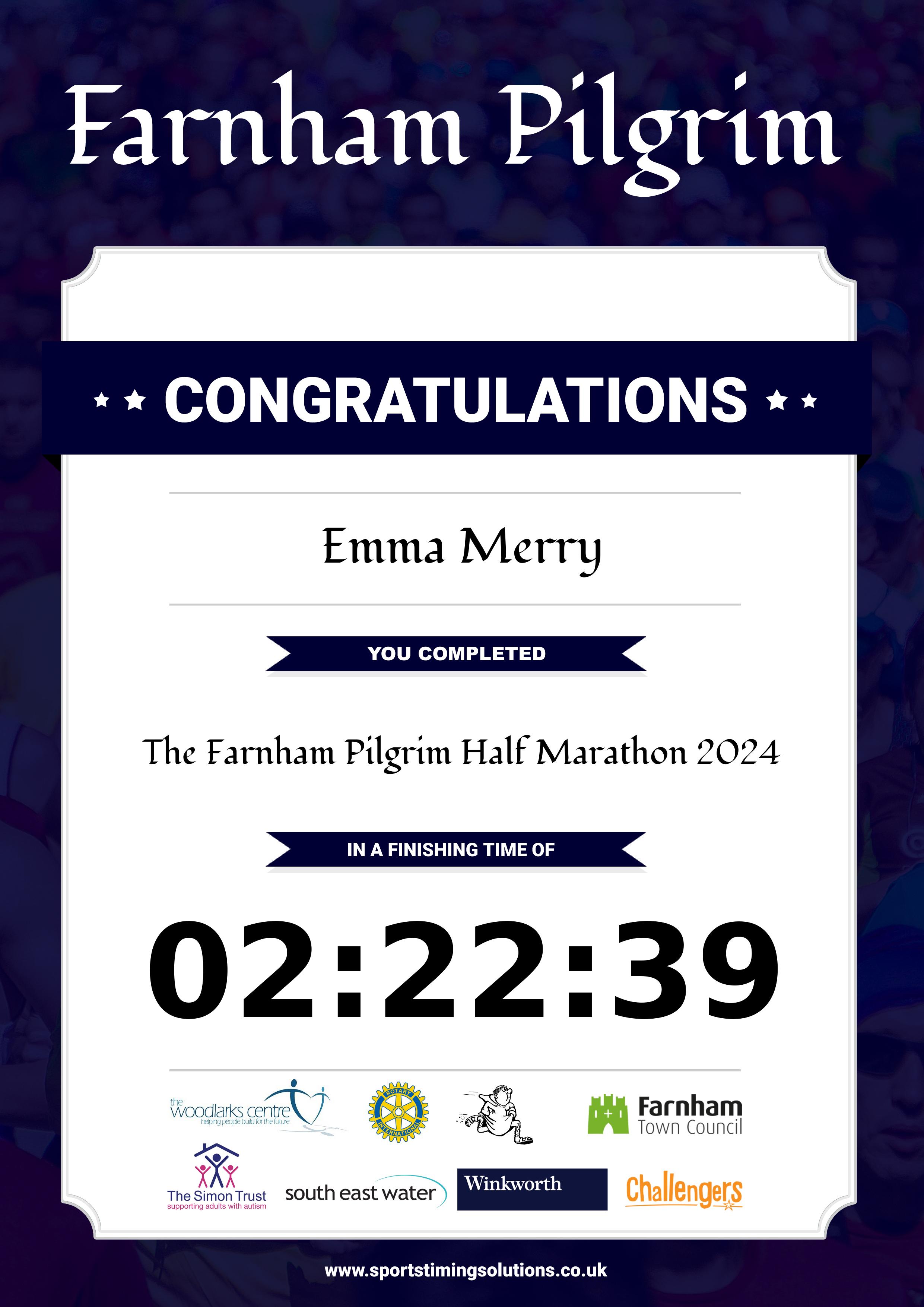 Congratulations Emma Merry after completing The Farnham Pilgrim Half Marathon 2024 why not remember your accomplishment by purchasing our unique professionally printed, high quality 11oz race results mug. Keep that lasting memory forever. All of our race mugs mugs are personally designed and made to order and ready to deliver within 5–10 business days. Although our mugs are dishwasher safe the high temperatures of the dishwasher can fade the images. We advise handwashing only.Delivery is £3.50 Includes P&P. We only deliver within the UK