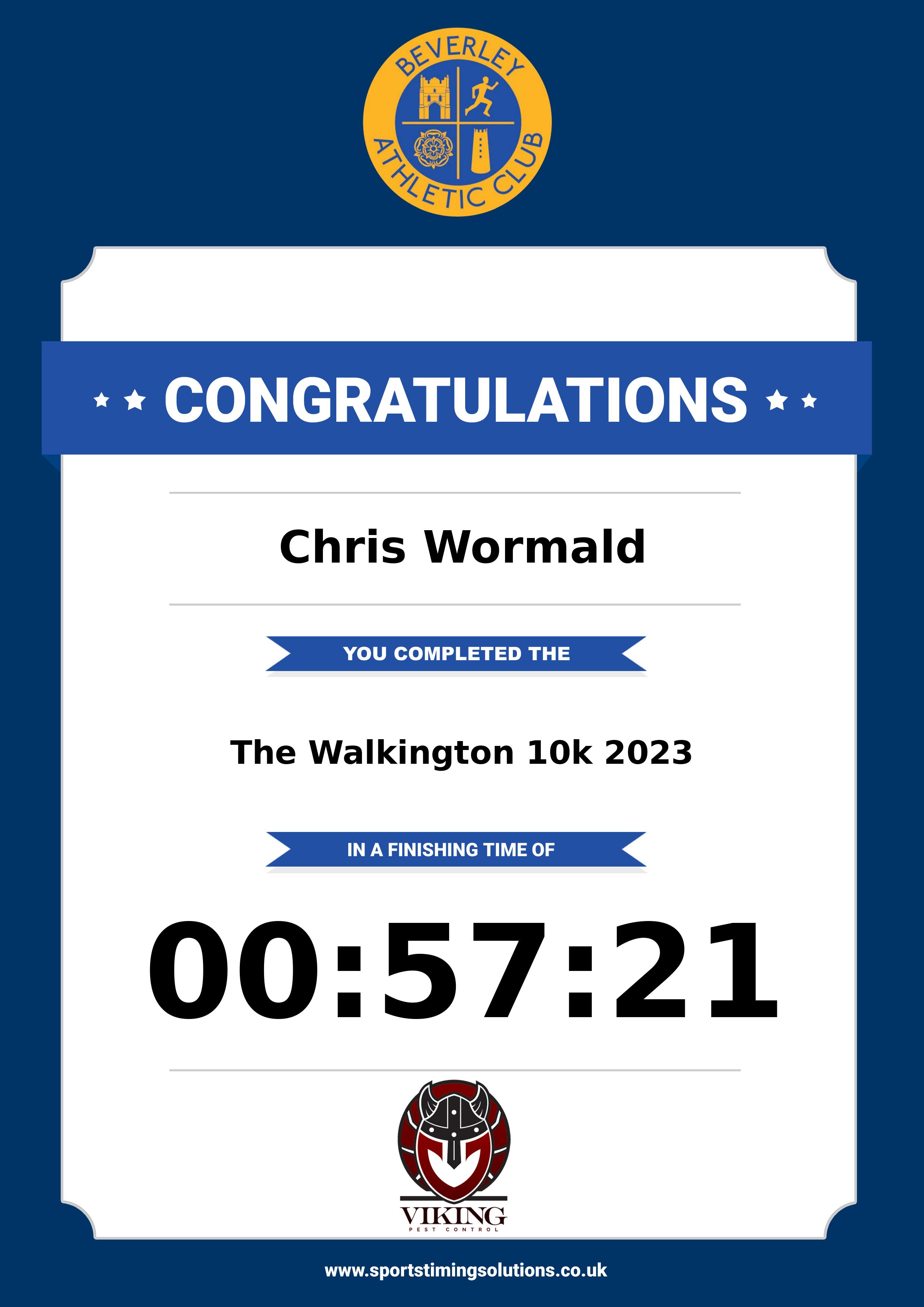 Congratulations Chris Wormald after completing The Walkington 10k 2023 why not remember your accomplishment by purchasing our unique professionally printed, high quality 11oz race results mug. Keep that lasting memory forever. All of our race mugs mugs are personally designed and made to order and ready to deliver within 5–10 business days. Although our mugs are dishwasher safe the high temperatures of the dishwasher can fade the images. We advise handwashing only.Delivery is £3.50 Includes P&P. We only deliver within the UK