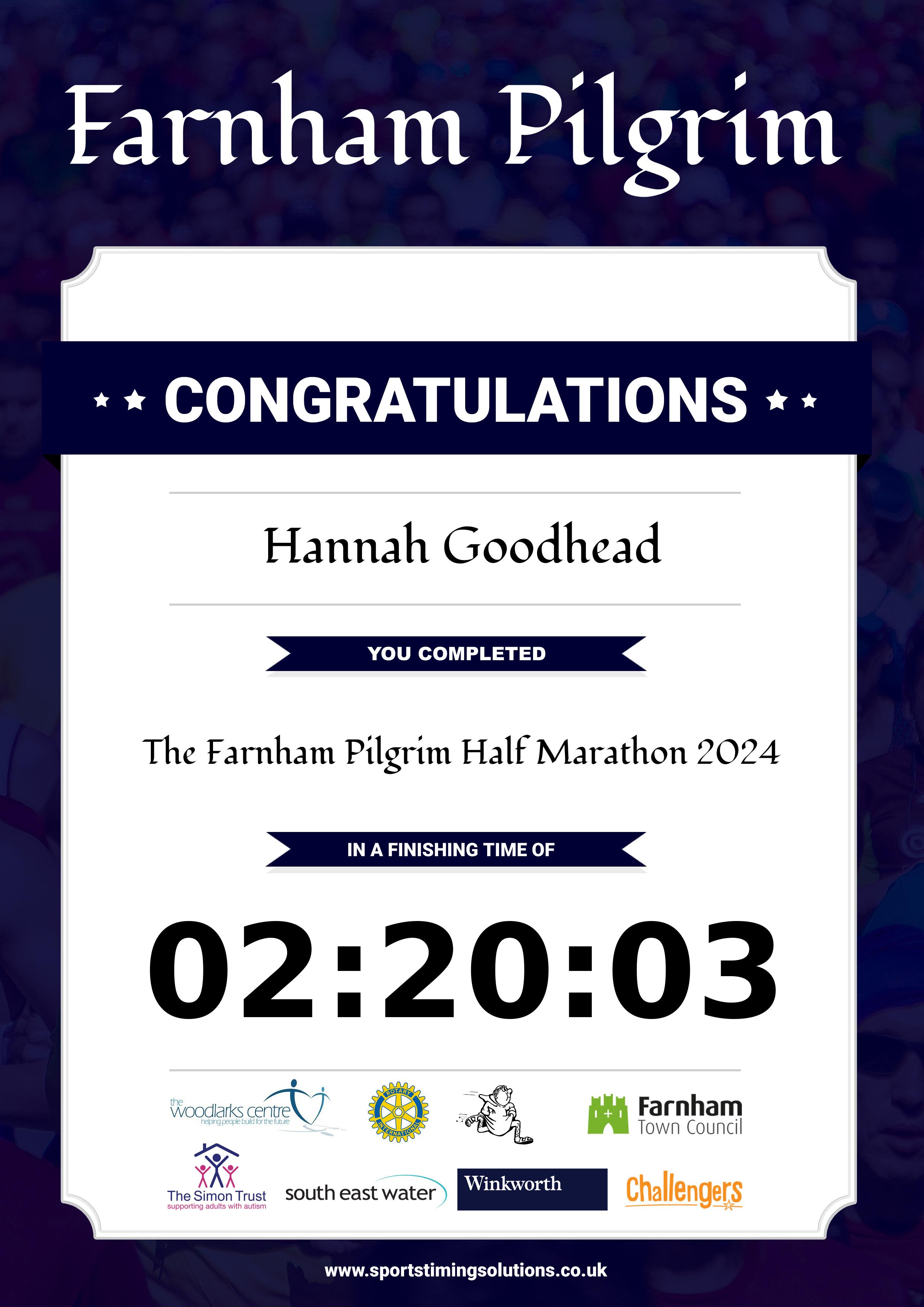 Congratulations Hannah Goodhead after completing The Farnham Pilgrim Half Marathon 2024 why not remember your accomplishment by purchasing our unique professionally printed, high quality 11oz race results mug. Keep that lasting memory forever. All of our race mugs mugs are personally designed and made to order and ready to deliver within 5–10 business days. Although our mugs are dishwasher safe the high temperatures of the dishwasher can fade the images. We advise handwashing only.Delivery is £3.50 Includes P&P. We only deliver within the UK