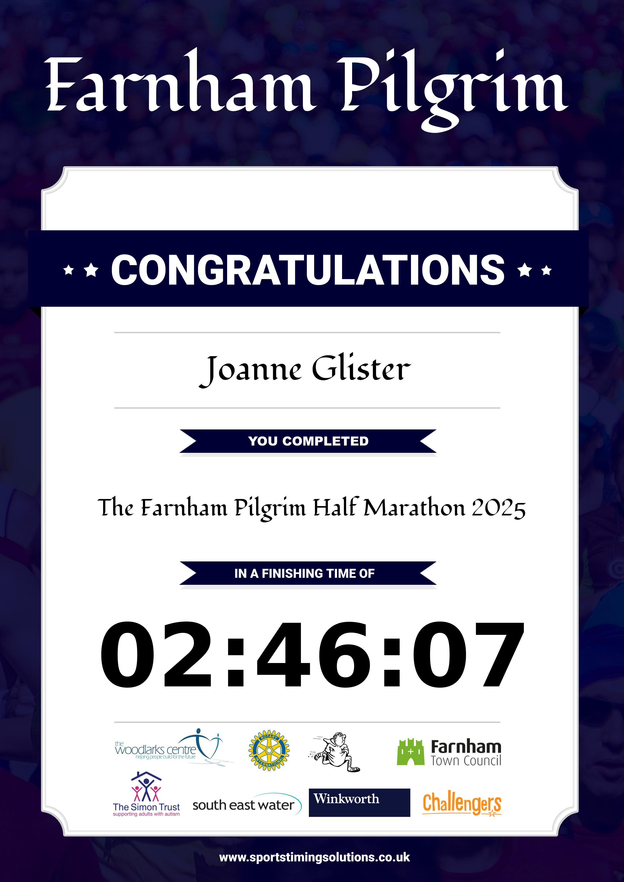 Congratulations Joanne Glister after completing The Farnham Pilgrim Half Marathon 2025 why not remember your accomplishment by purchasing our unique professionally printed, high quality 11oz race results mug. Keep that lasting memory forever. All of our race mugs mugs are personally designed and made to order and ready to deliver within 5–10 business days. Although our mugs are dishwasher safe the high temperatures of the dishwasher can fade the images. We advise handwashing only.Delivery is £3.50 Includes P&P. We only deliver within the UK