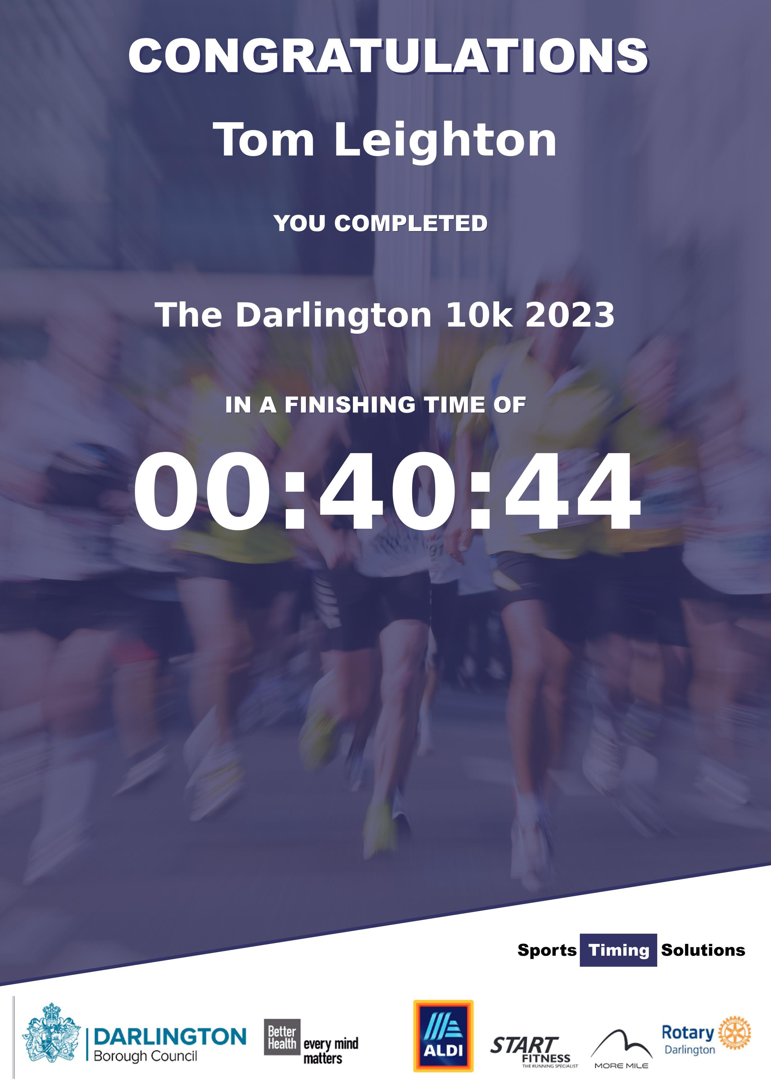Congratulations Tom Leighton after completing The Darlington 10k 2023 why not remember your accomplishment by purchasing our unique professionally printed, high quality 11oz race results mug. Keep that lasting memory forever. All of our race mugs mugs are personally designed and made to order and ready to deliver within 5–10 business days. Although our mugs are dishwasher safe the high temperatures of the dishwasher can fade the images. We advise handwashing only.Delivery is £3.50 Includes P&P. We only deliver within the UK