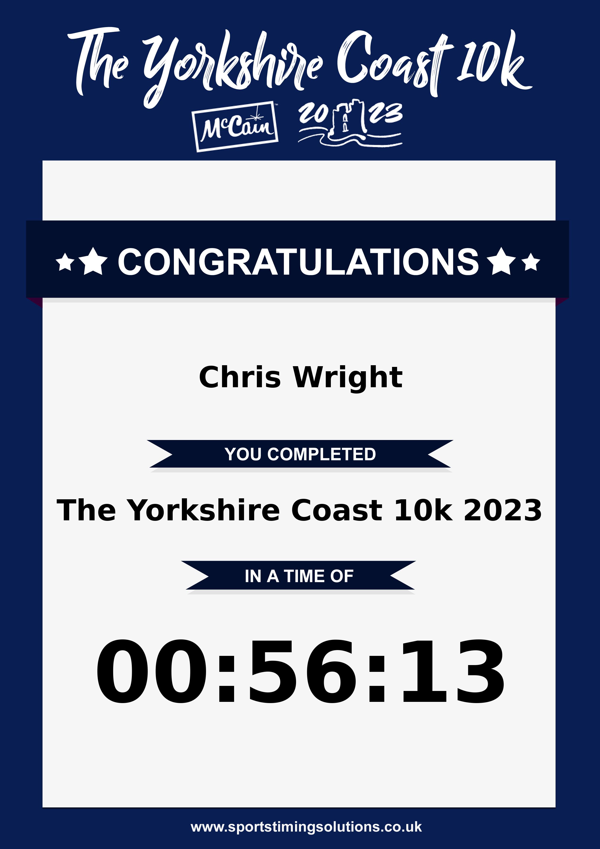Congratulations Chris Wright after completing The Yorkshire Coast 10k 2023 why not remember your accomplishment by purchasing a professionally printed, high quality 11oz mug. Keep that lasting memory forever. All of our mugs are personally designed and made to order and ready to deliver within 5–7 business days. Although our mugs are dishwasher safe the high temperatures of the dishwasher can fade the images. We advise handwashing only.Delivery is £3.50 We only deliver within the UK