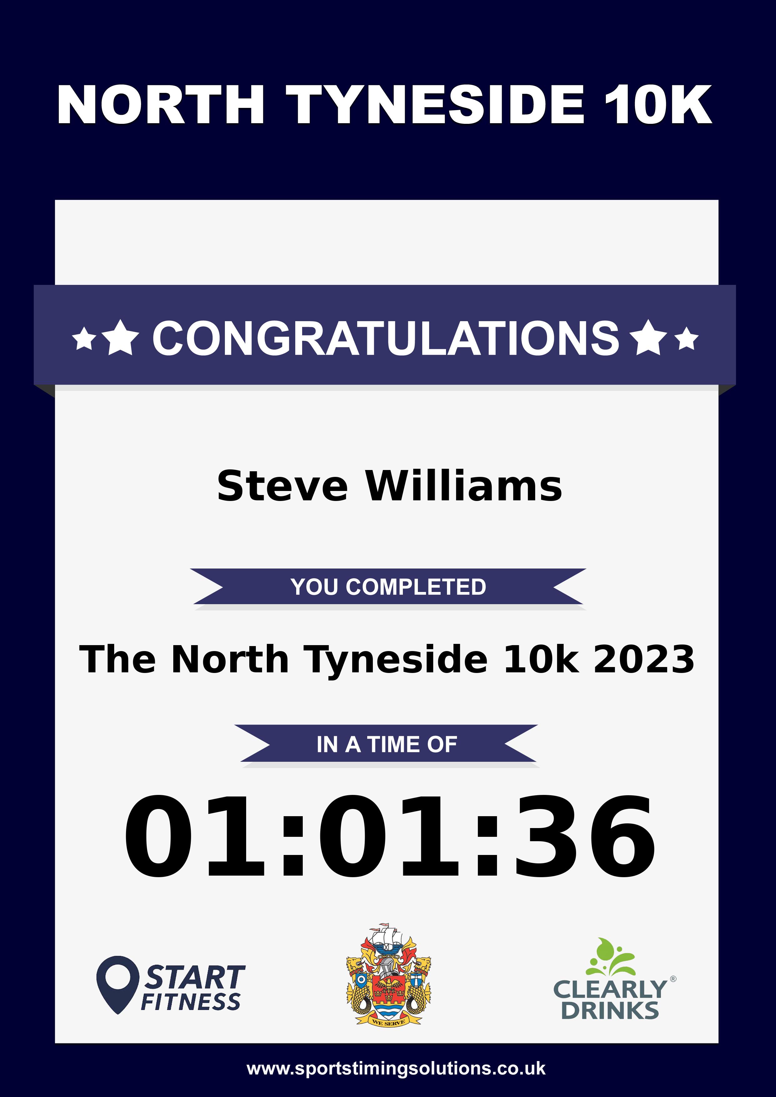 Congratulations Steve Williams after completing The North Tyneside 10k 2023 why not remember your accomplishment by purchasing a professionally printed, high quality 11oz mug. Keep that lasting memory forever. All of our mugs are personally designed and made to order and ready to deliver within 5–7 business days. Although our mugs are dishwasher safe the high temperatures of the dishwasher can fade the images. We advise handwashing only.Delivery is £3.50 We only deliver within the UK