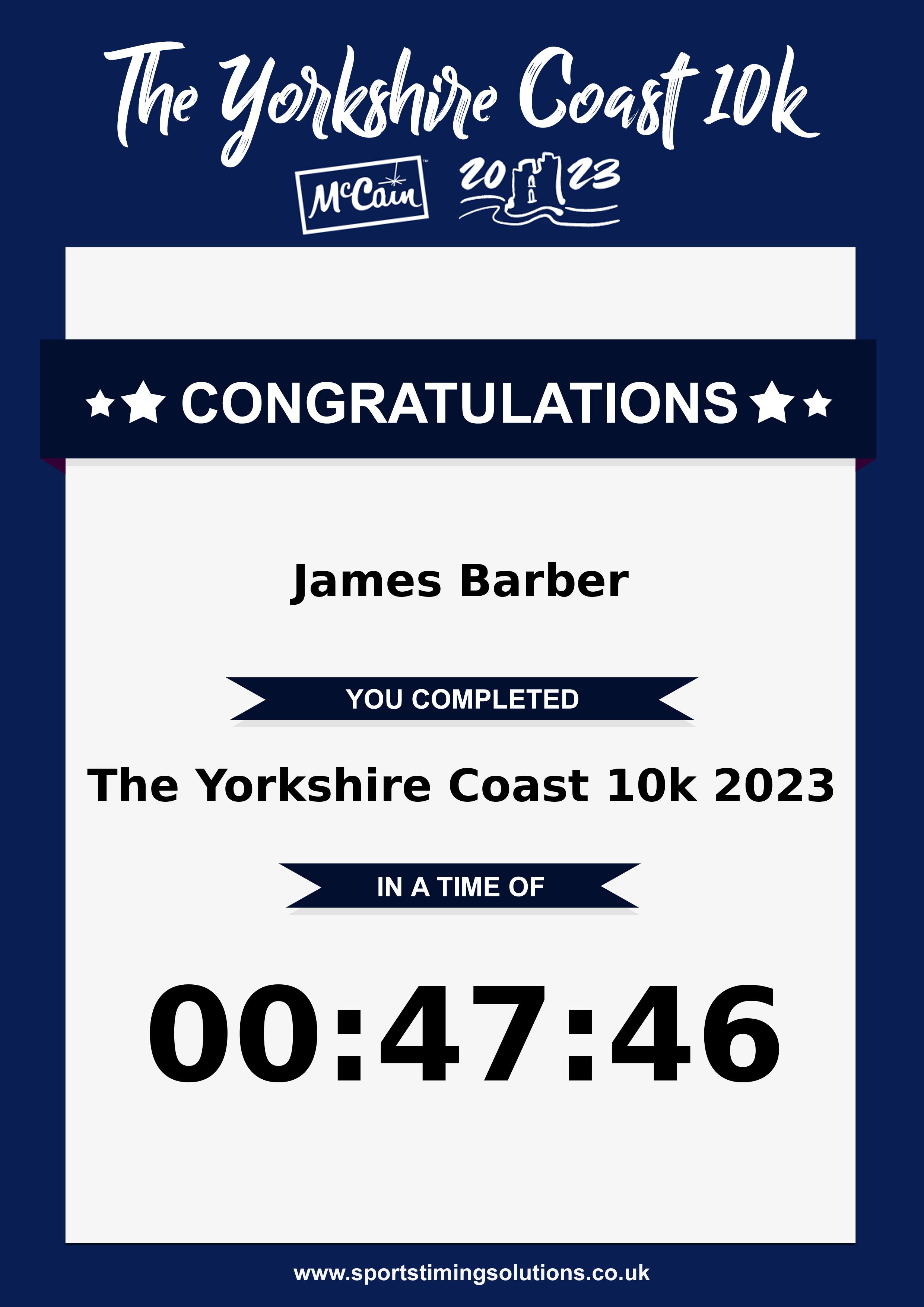 Congratulations James Barber after completing The Yorkshire Coast 10k 2023 why not remember your accomplishment by purchasing our unique professionally printed, high quality 11oz race results mug. Keep that lasting memory forever. All of our race mugs mugs are personally designed and made to order and ready to deliver within 5–10 business days. Although our mugs are dishwasher safe the high temperatures of the dishwasher can fade the images. We advise handwashing only.Delivery is £3.50 Includes P&P. We only deliver within the UK