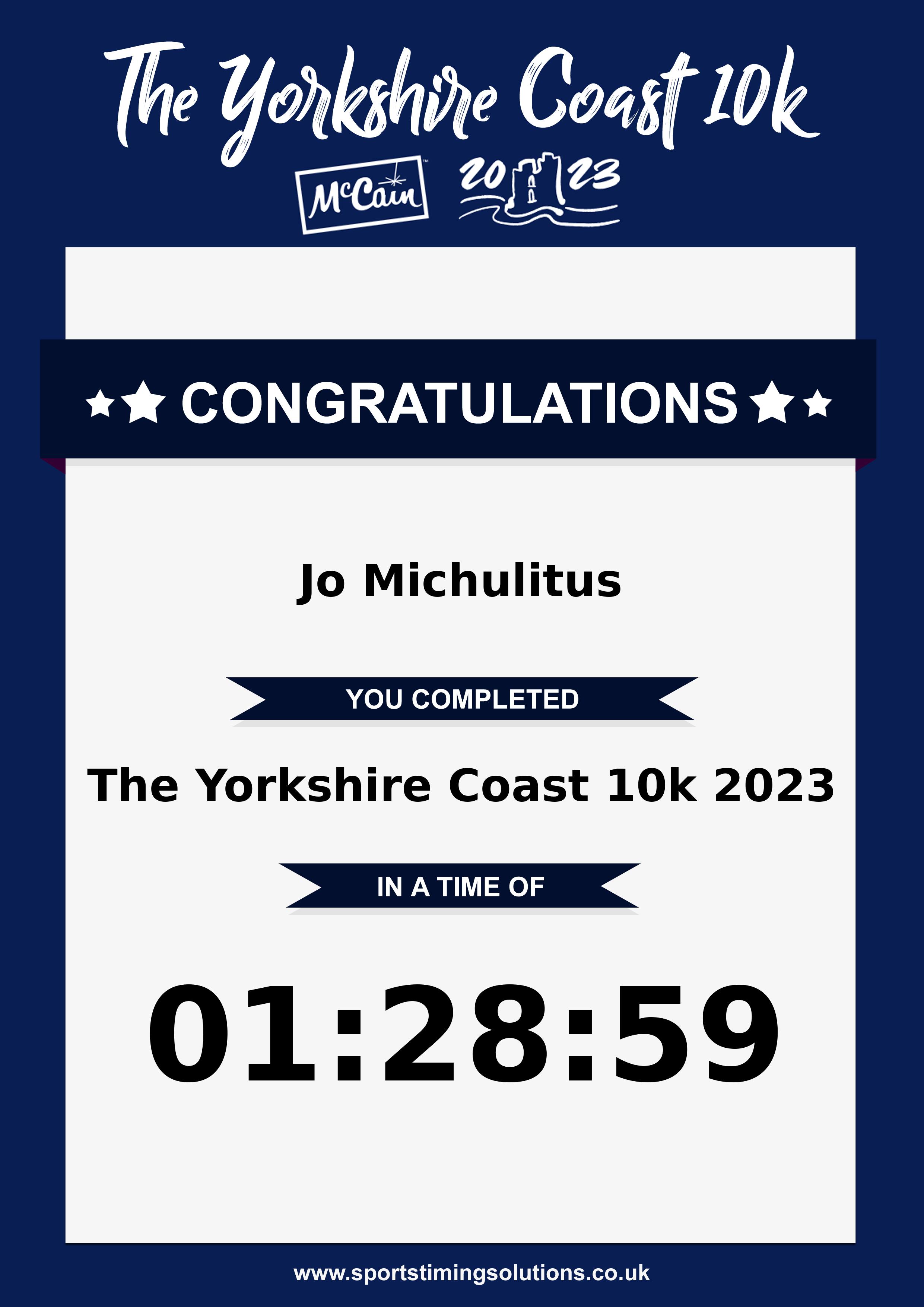 Congratulations Jo Michulitus after completing The Yorkshire Coast 10k 2023 why not remember your accomplishment by purchasing a professionally printed, high quality 11oz mug. Keep that lasting memory forever. All of our mugs are personally designed and made to order and ready to deliver within 5–7 business days. Although our mugs are dishwasher safe the high temperatures of the dishwasher can fade the images. We advise handwashing only.Delivery is £3.50 We only deliver within the UK