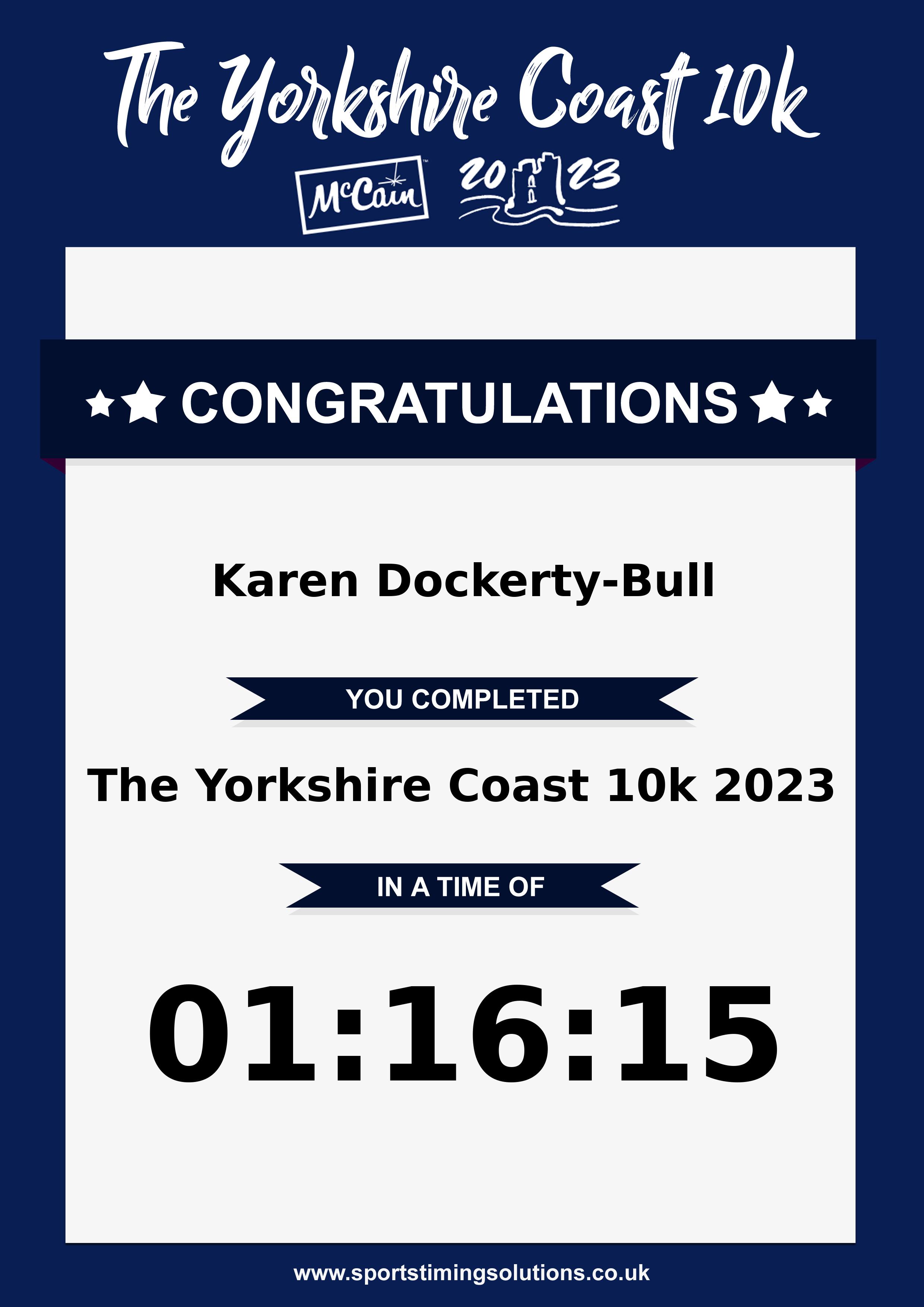 Congratulations Karen Dockerty-Bull after completing The Yorkshire Coast 10k 2023 why not remember your accomplishment by purchasing a professionally printed, high quality 11oz mug. Keep that lasting memory forever. All of our mugs are personally designed and made to order and ready to deliver within 5–7 business days. Although our mugs are dishwasher safe the high temperatures of the dishwasher can fade the images. We advise handwashing only.Delivery is £3.50 We only deliver within the UK