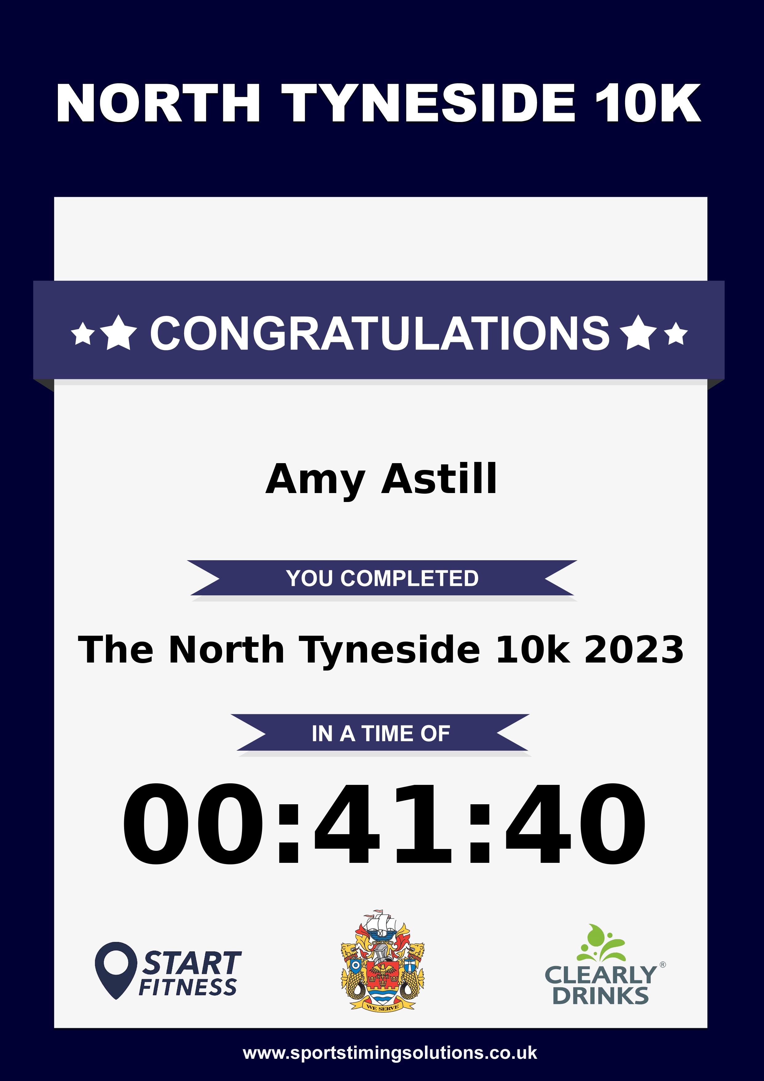 Congratulations Amy Astill after completing The North Tyneside 10k 2023 why not remember your accomplishment by purchasing a professionally printed, high quality 11oz mug. Keep that lasting memory forever. All of our mugs are personally designed and made to order and ready to deliver within 5–7 business days. Although our mugs are dishwasher safe the high temperatures of the dishwasher can fade the images. We advise handwashing only.Delivery is £3.50 We only deliver within the UK