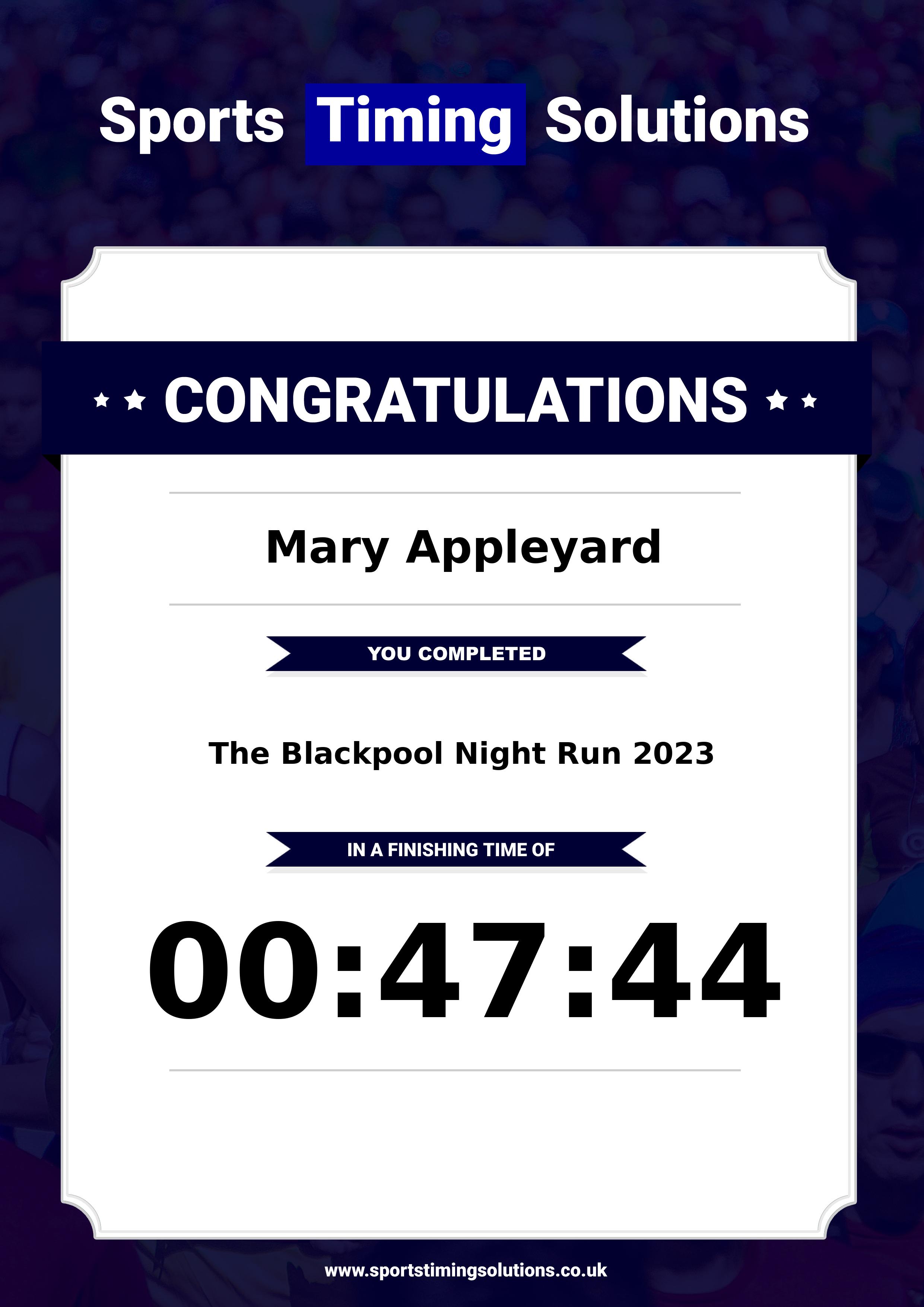 Congratulations Mary Appleyard after completing The Blackpool Night Run 2023 why not remember your accomplishment by purchasing our unique professionally printed, high quality 11oz race results mug. Keep that lasting memory forever. All of our race mugs mugs are personally designed and made to order and ready to deliver within 5–10 business days. Although our mugs are dishwasher safe the high temperatures of the dishwasher can fade the images. We advise handwashing only.Delivery is £3.50 Includes P&P. We only deliver within the UK