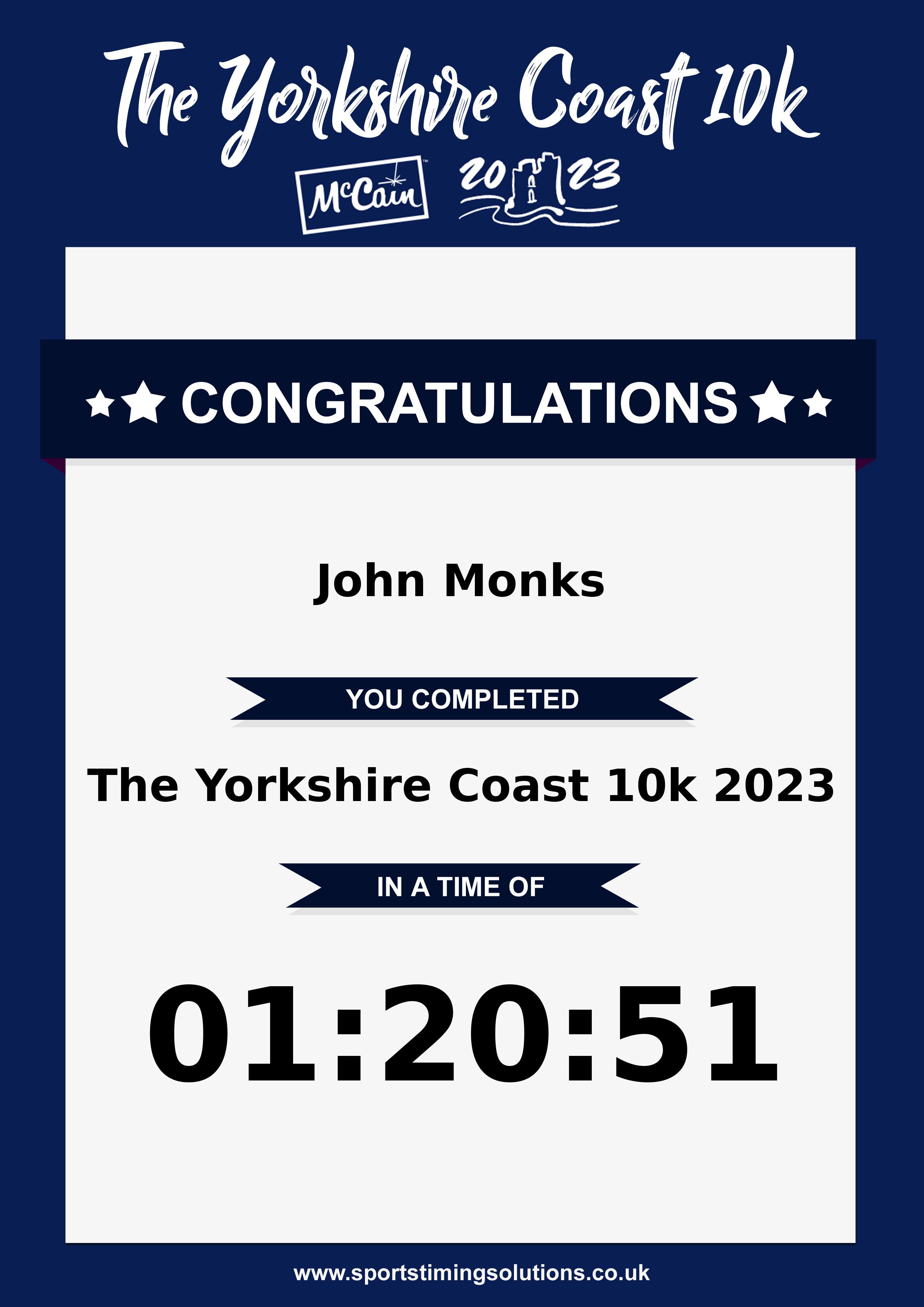 Congratulations John Monks after completing The Yorkshire Coast 10k 2023 why not remember your accomplishment by purchasing a professionally printed, high quality 11oz mug. Keep that lasting memory forever. All of our mugs are personally designed and made to order and ready to deliver within 5–7 business days. Although our mugs are dishwasher safe the high temperatures of the dishwasher can fade the images. We advise handwashing only.Delivery is £3.50 We only deliver within the UK