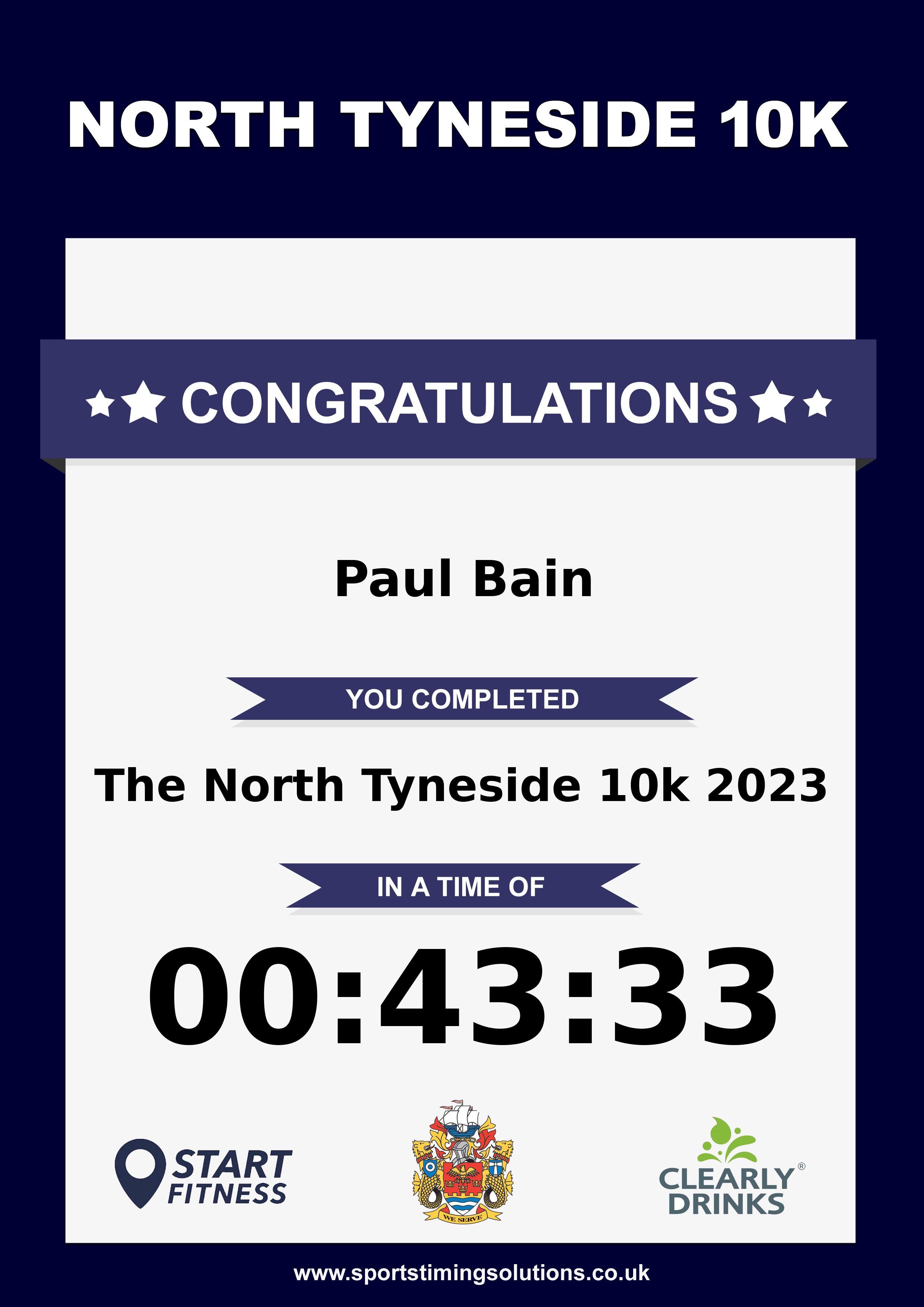 Congratulations Paul Bain after completing The North Tyneside 10k 2023 why not remember your accomplishment by purchasing a professionally printed, high quality 11oz mug. Keep that lasting memory forever. All of our mugs are personally designed and made to order and ready to deliver within 5–7 business days. Although our mugs are dishwasher safe the high temperatures of the dishwasher can fade the images. We advise handwashing only.Delivery is £3.50 We only deliver within the UK