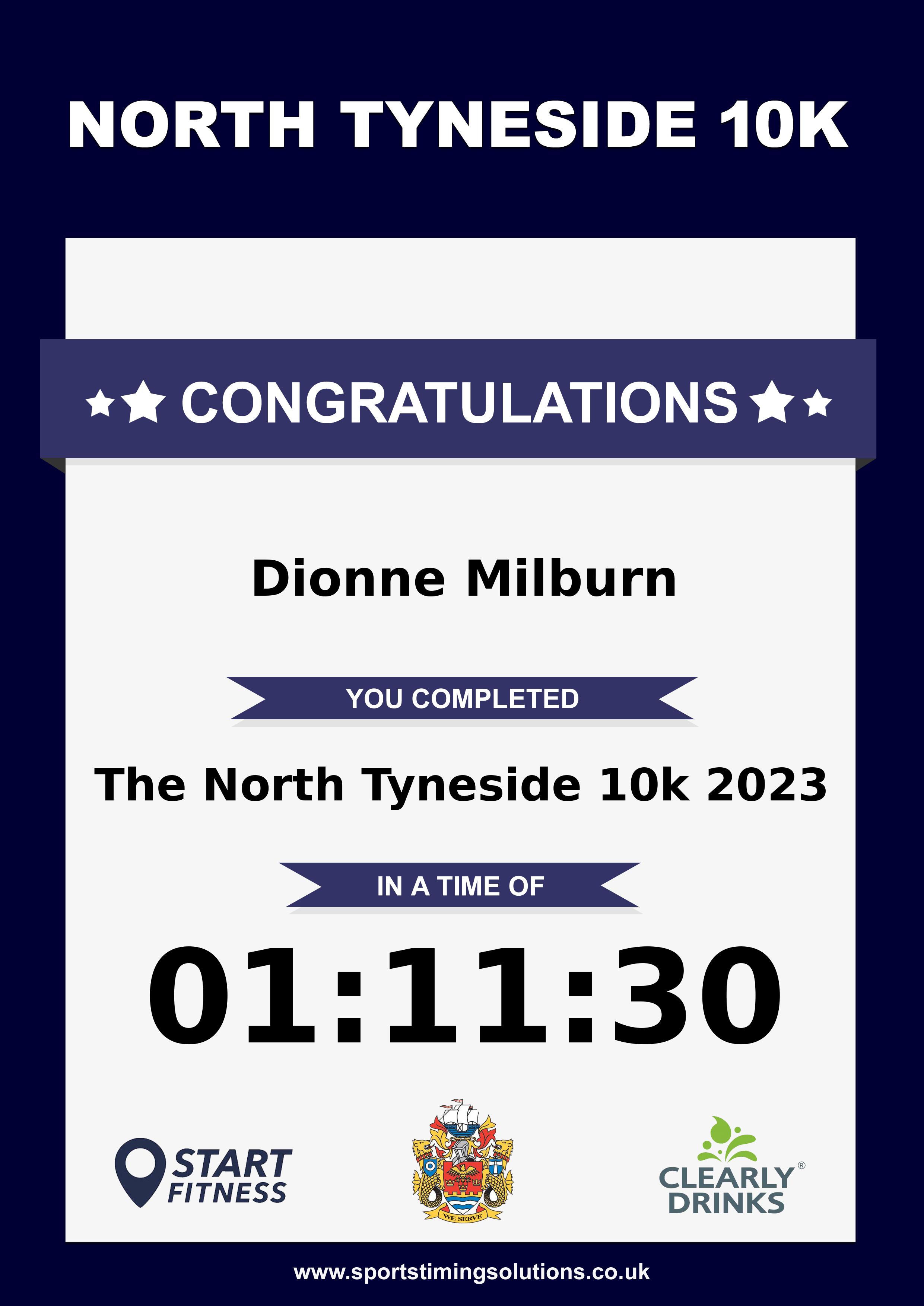 Congratulations Dionne Milburn after completing The North Tyneside 10k 2023 why not remember your accomplishment by purchasing a professionally printed, high quality 11oz mug. Keep that lasting memory forever. All of our mugs are personally designed and made to order and ready to deliver within 5–7 business days. Although our mugs are dishwasher safe the high temperatures of the dishwasher can fade the images. We advise handwashing only.Delivery is £3.50 We only deliver within the UK