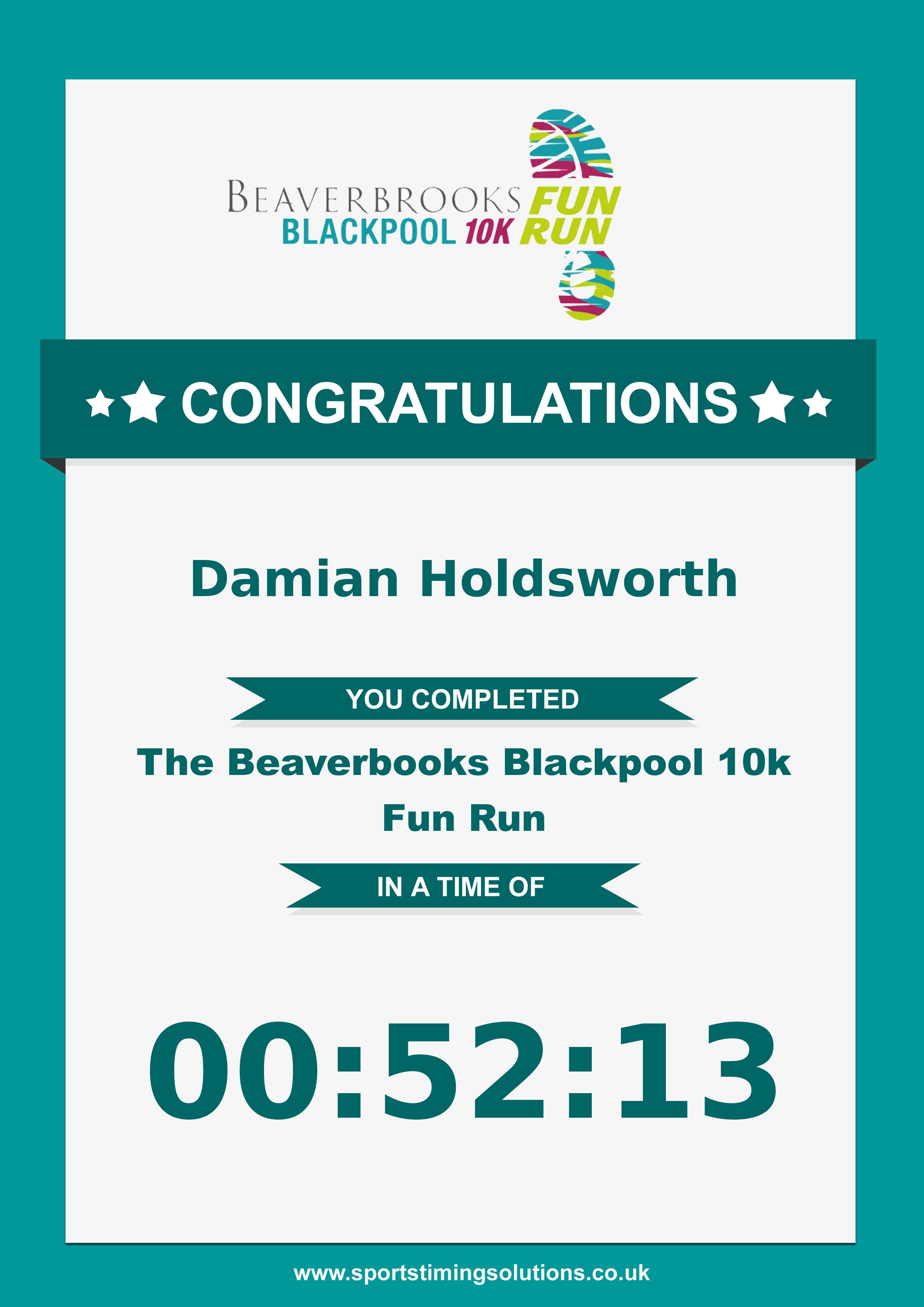 Congratulations Damian Holdsworth after completing Beaverbrooks Blackpool 10k Fun Run 2023 why not remember your accomplishment by purchasing a professionally printed, high quality 11oz mug. Keep that lasting memory forever. All of our mugs are personally designed and made to order and ready to deliver within 5–7 business days. Although our mugs are dishwasher safe the high temperatures of the dishwasher can fade the images. We advise handwashing only.Delivery is £3.50 We only deliver within the UK