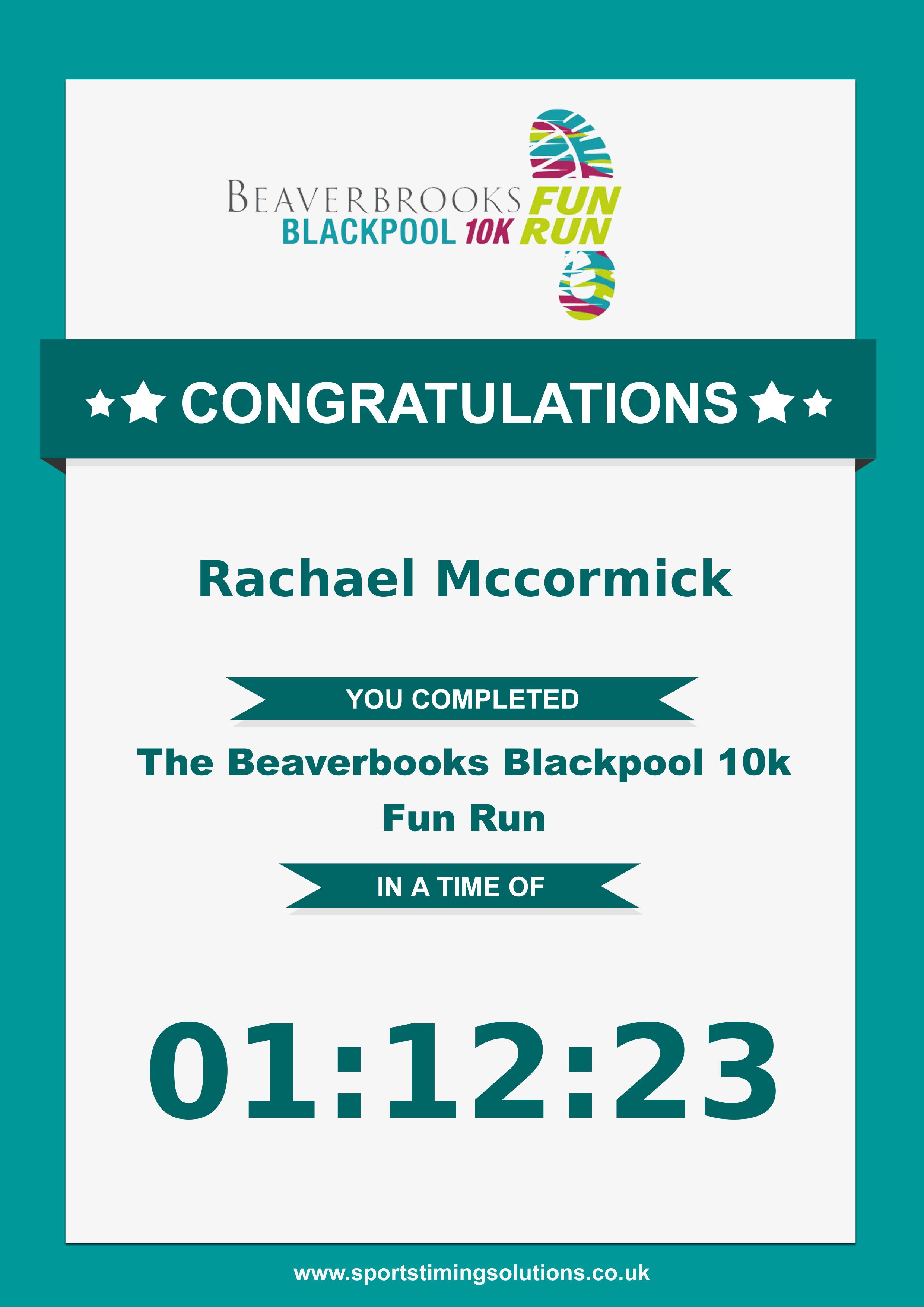Congratulations Rachael Mccormick after completing Beaverbrooks Blackpool 10k Fun Run 2023 why not remember your accomplishment by purchasing a professionally printed, high quality 11oz mug. Keep that lasting memory forever. All of our mugs are personally designed and made to order and ready to deliver within 5–7 business days. Although our mugs are dishwasher safe the high temperatures of the dishwasher can fade the images. We advise handwashing only.Delivery is £3.50 We only deliver within the UK