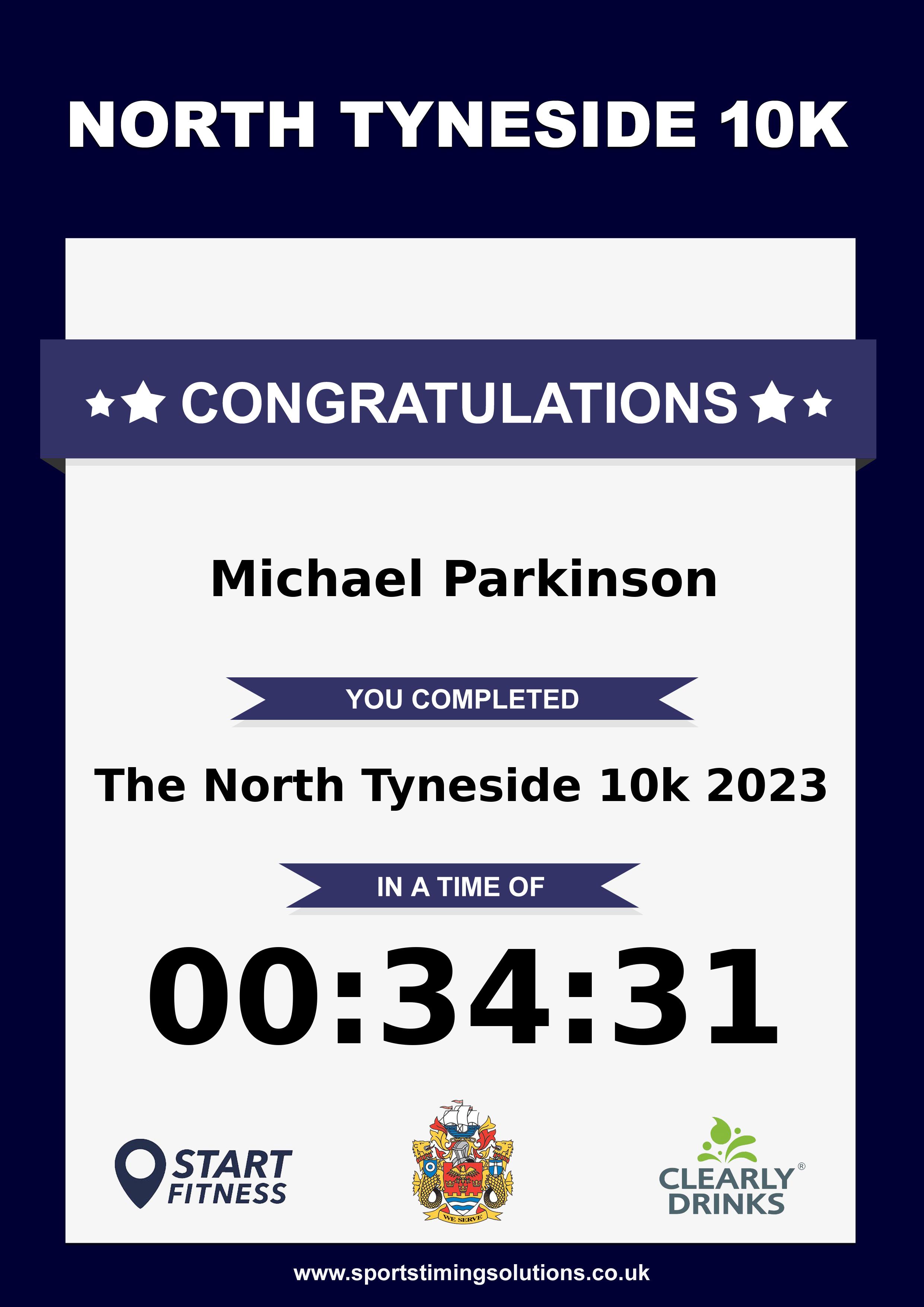 Congratulations Michael Parkinson after completing The North Tyneside 10k 2023 why not remember your accomplishment by purchasing a professionally printed, high quality 11oz mug. Keep that lasting memory forever. All of our mugs are personally designed and made to order and ready to deliver within 5–7 business days. Although our mugs are dishwasher safe the high temperatures of the dishwasher can fade the images. We advise handwashing only.Delivery is £3.50 We only deliver within the UK