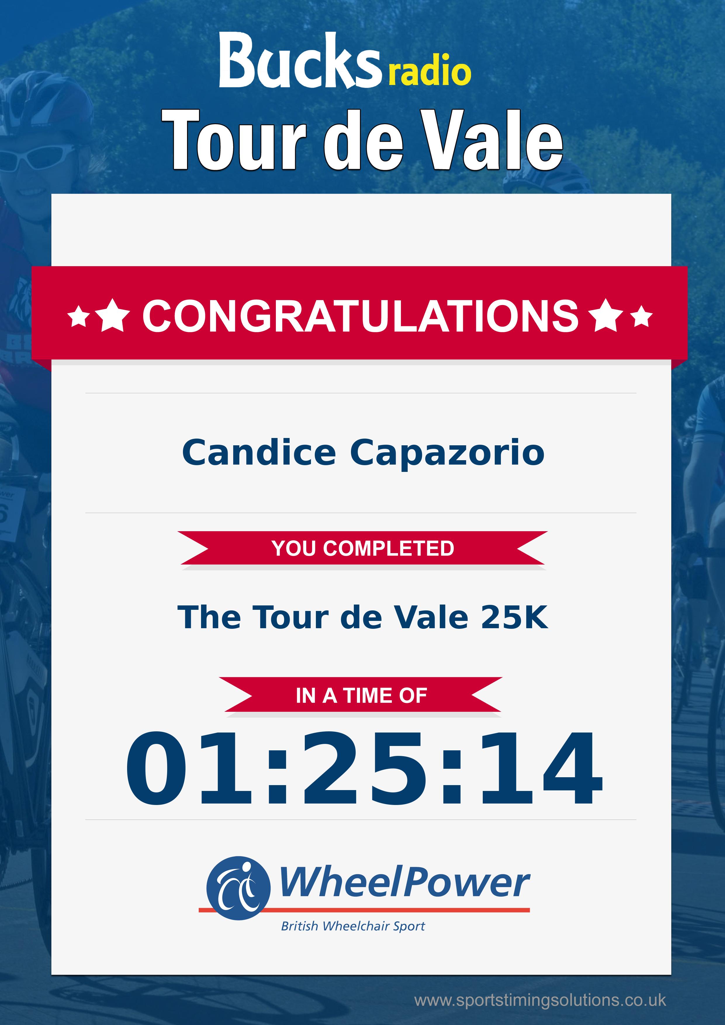 Congratulations Candice Capazorio after completing The Bucks Radio Tour De Vale Sportive 2023 why not remember your accomplishment by purchasing a professionally printed, high quality 11oz mug. Keep that lasting memory forever.