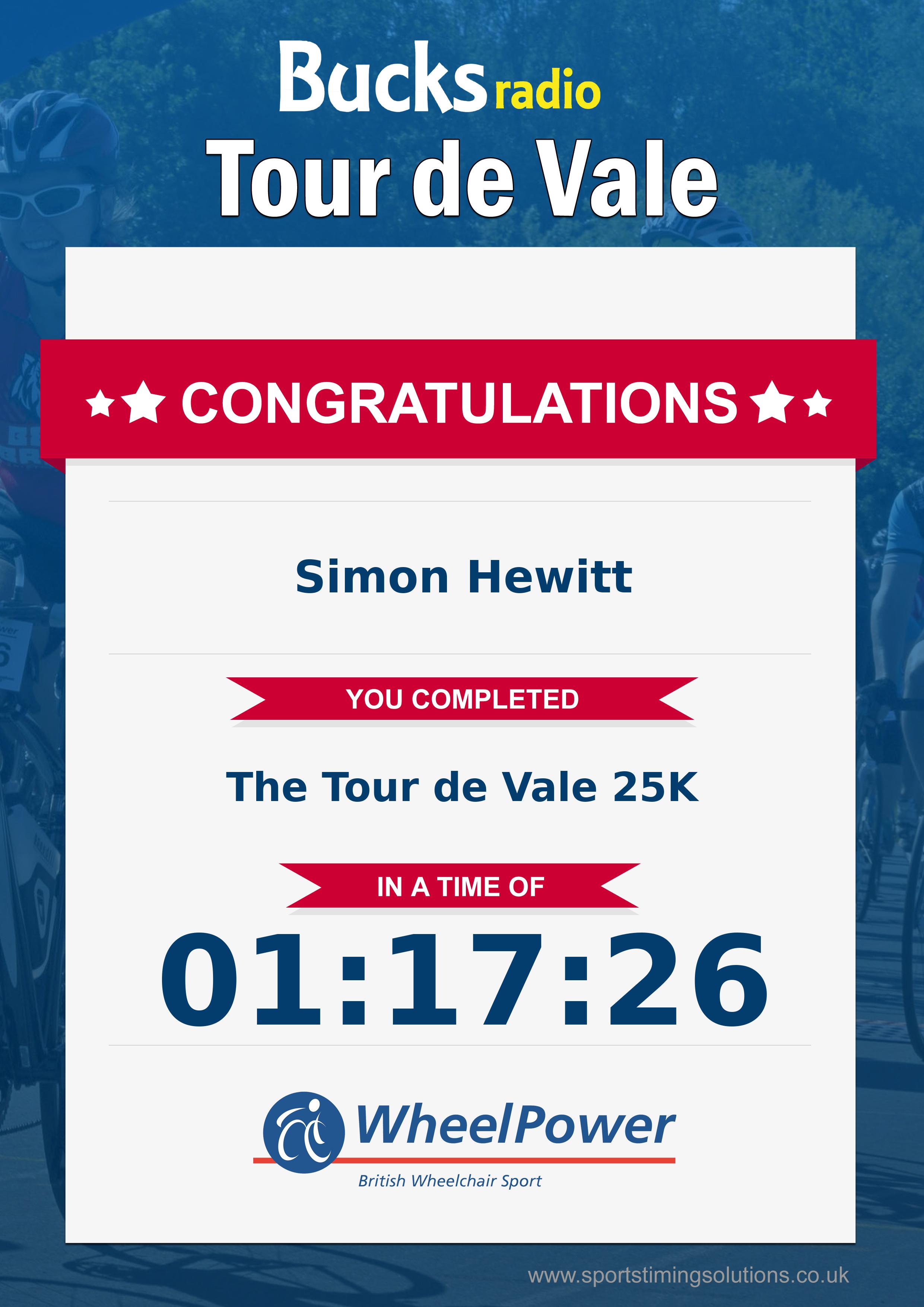 Congratulations Simon Hewitt after completing The Bucks Radio Tour De Vale Sportive 2023 why not remember your accomplishment by purchasing a professionally printed, high quality 11oz mug. Keep that lasting memory forever.