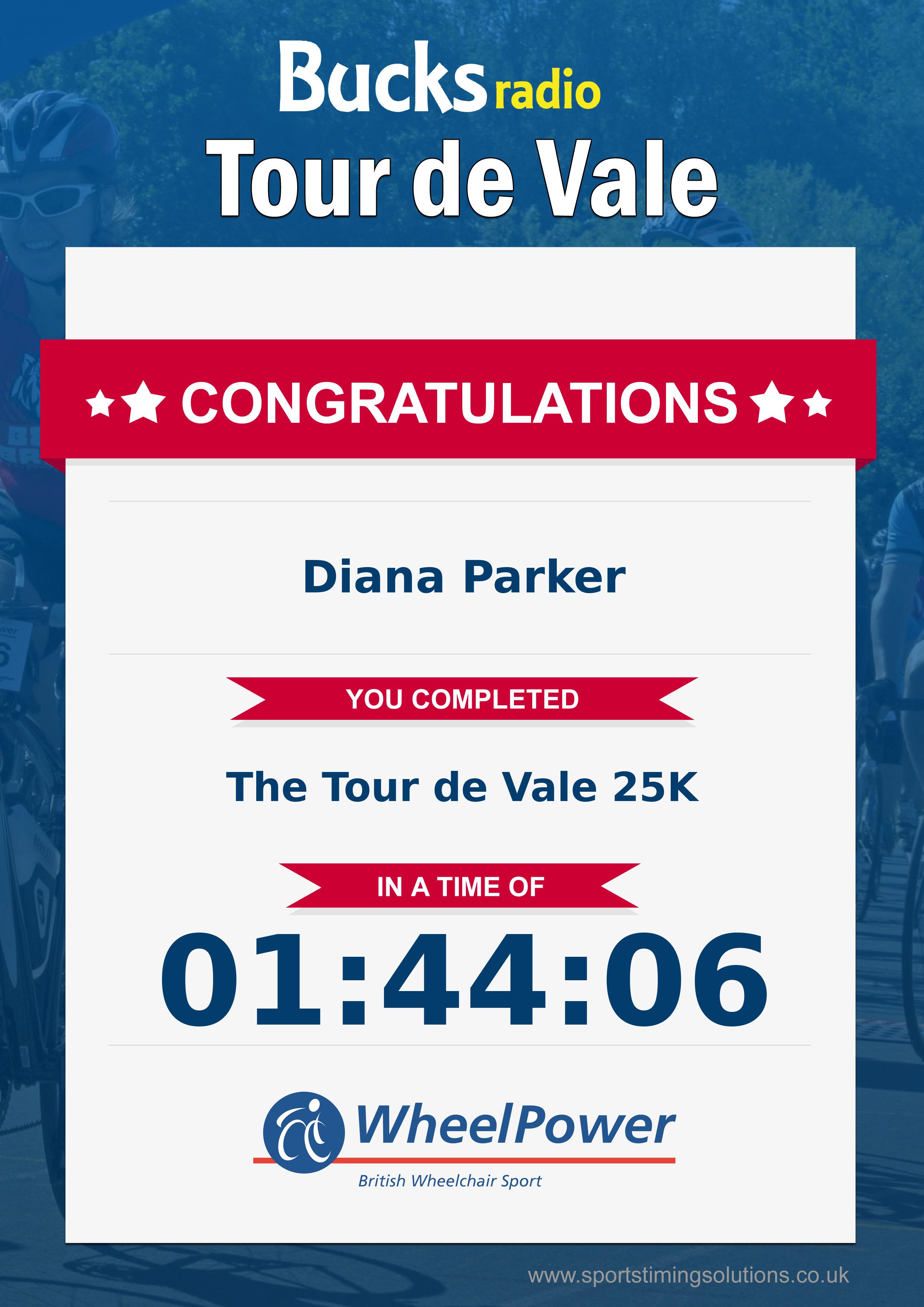 Congratulations Diana Parker after completing The Bucks Radio Tour De Vale Sportive 2023 why not remember your accomplishment by purchasing a professionally printed, high quality 11oz mug. Keep that lasting memory forever.