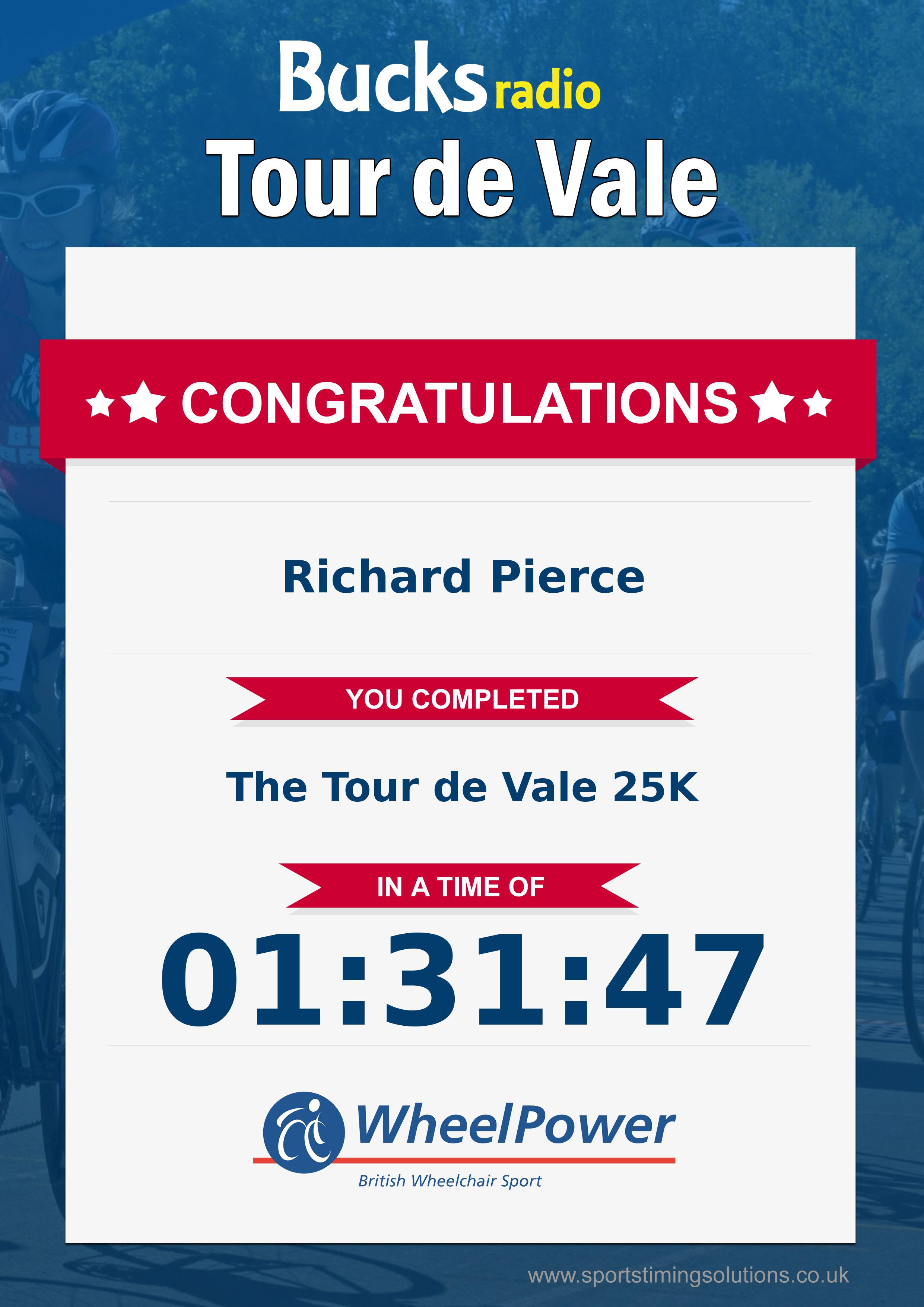 Congratulations Richard Pierce after completing The Bucks Radio Tour De Vale Sportive 2023 why not remember your accomplishment by purchasing a professionally printed, high quality 11oz mug. Keep that lasting memory forever.