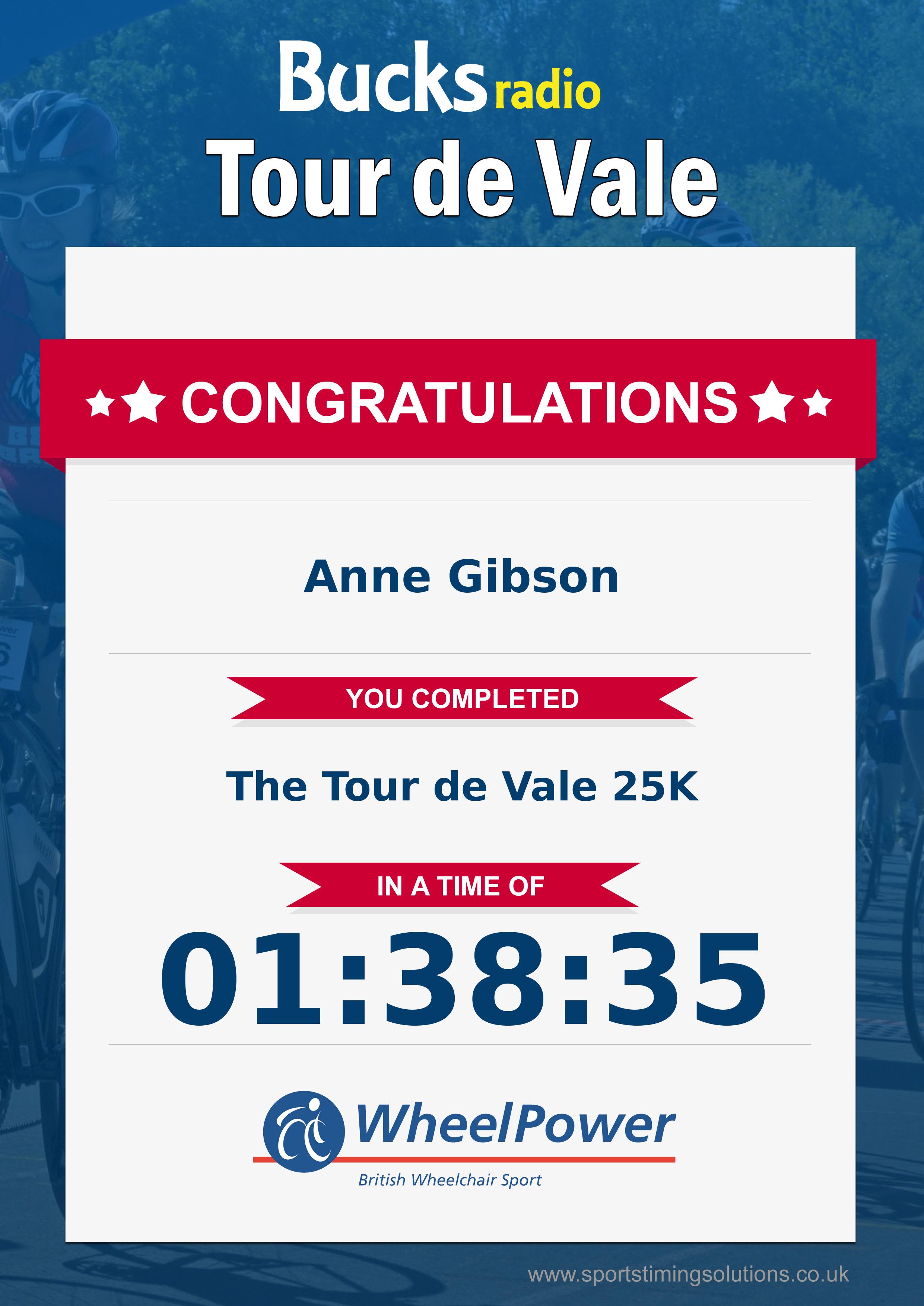 Congratulations Anne Gibson after completing The Bucks Radio Tour De Vale Sportive 2023 why not remember your accomplishment by purchasing a professionally printed, high quality 11oz mug. Keep that lasting memory forever.